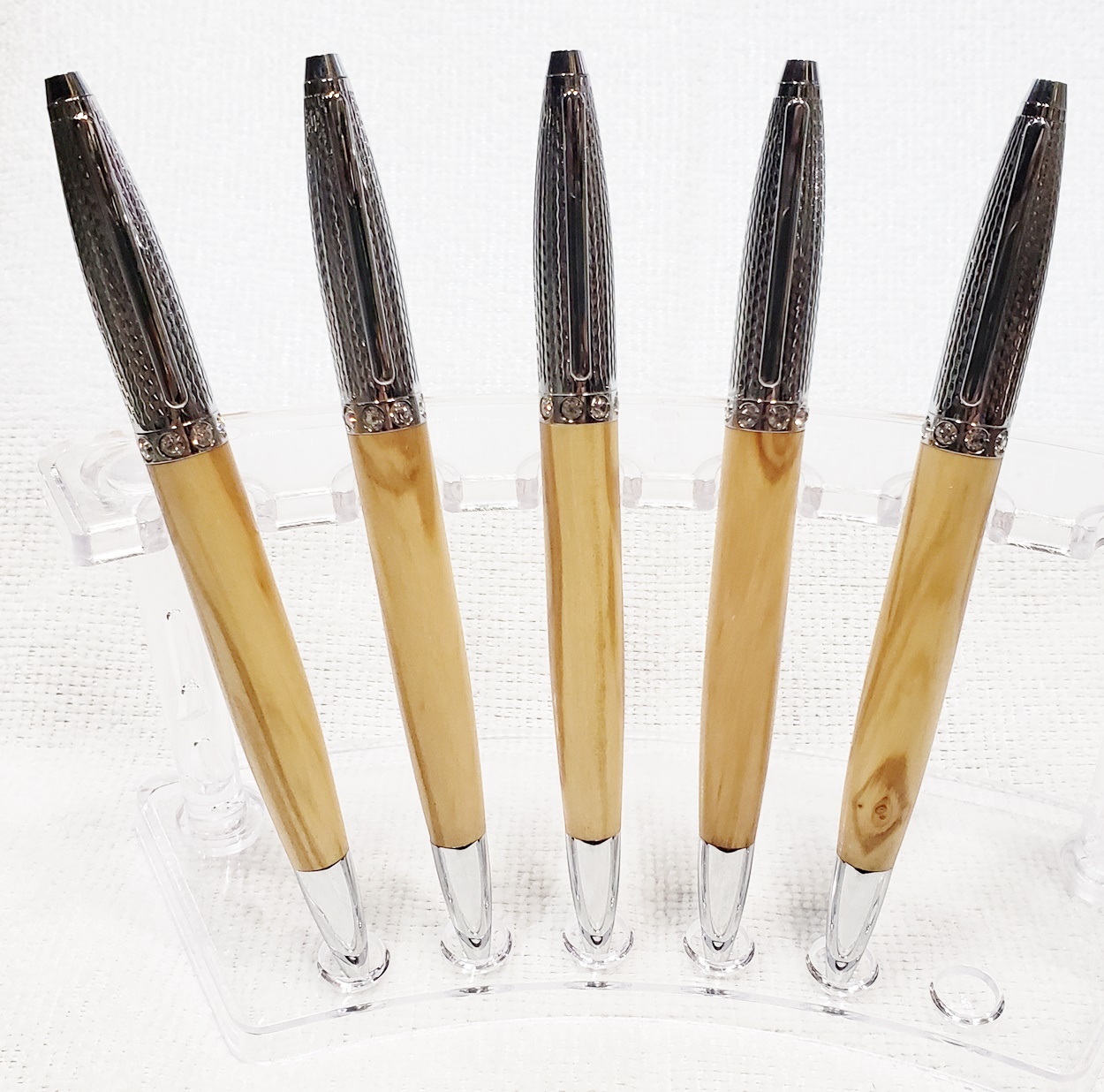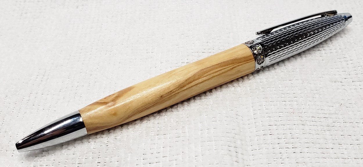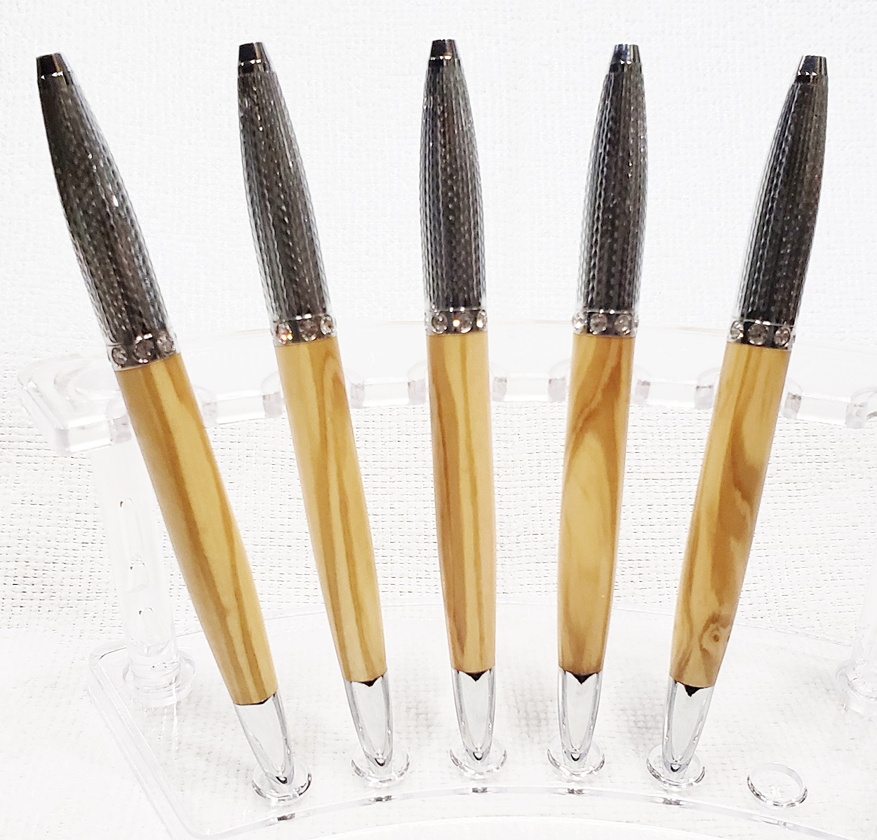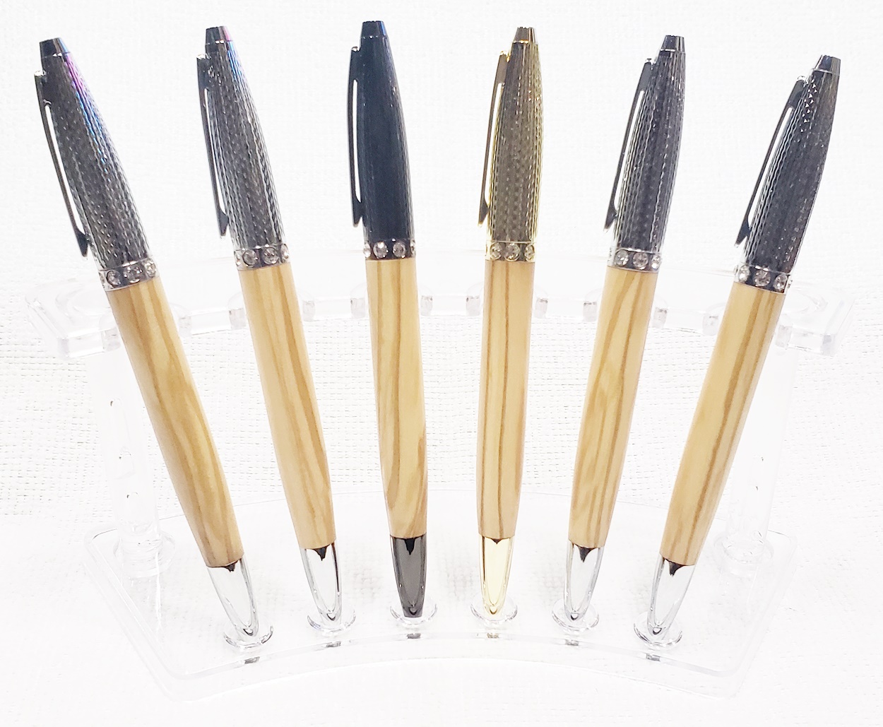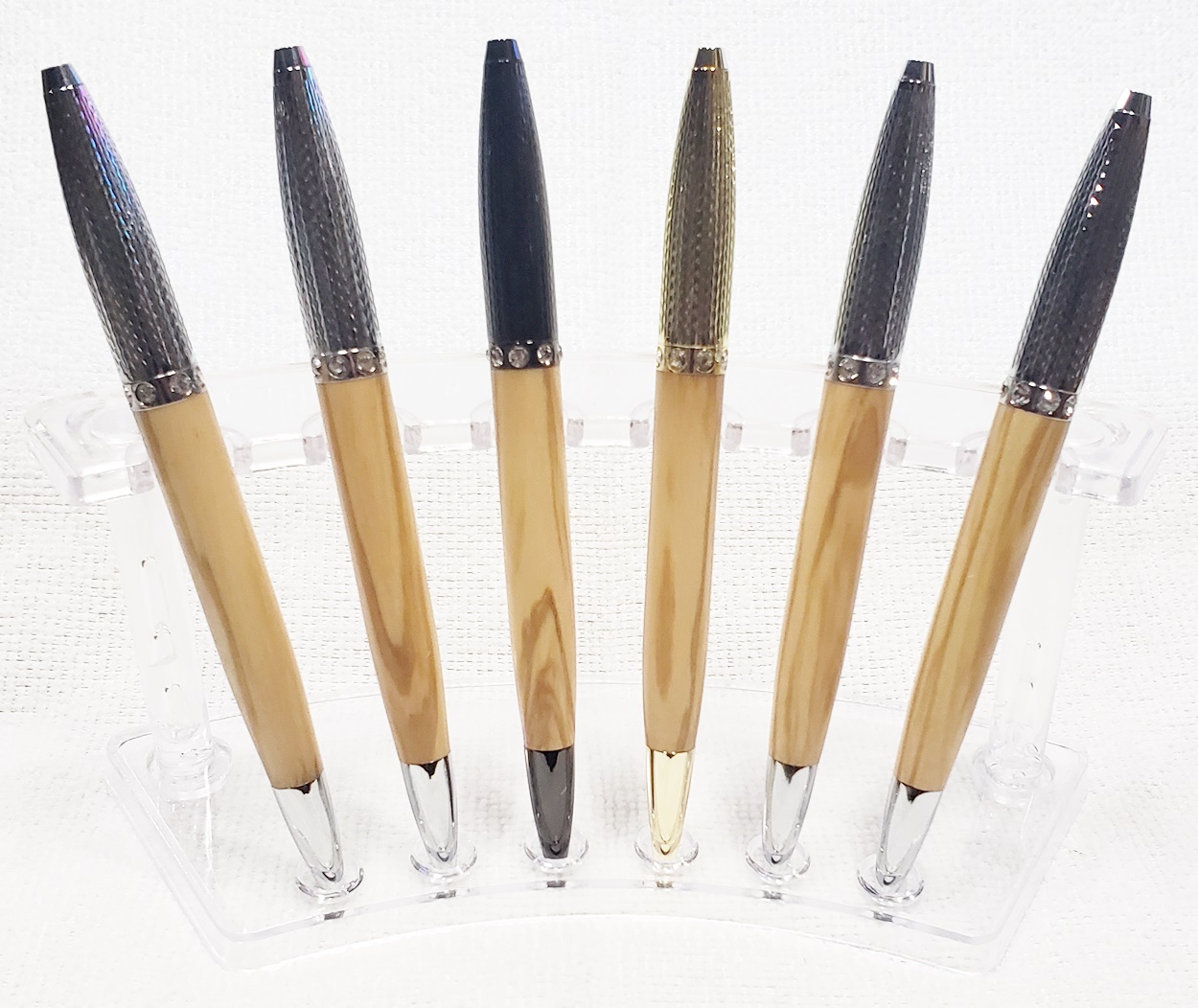 These are Marchesa pens from Crooked Mill, 11 of them. All are chrome, except for one gunmetal and one gold. They look to be a copy of the PSI Duchess pens. I like the crystals. The wood is Roman Olive from Woodcraft. The finish is Pens Plus. They're Christmas presents for the girls at work, I'm getting an early start. Now I have to engrave all of them.