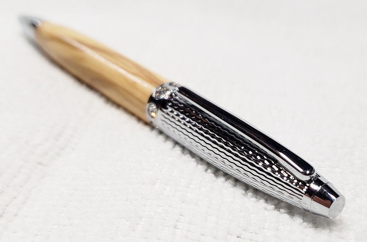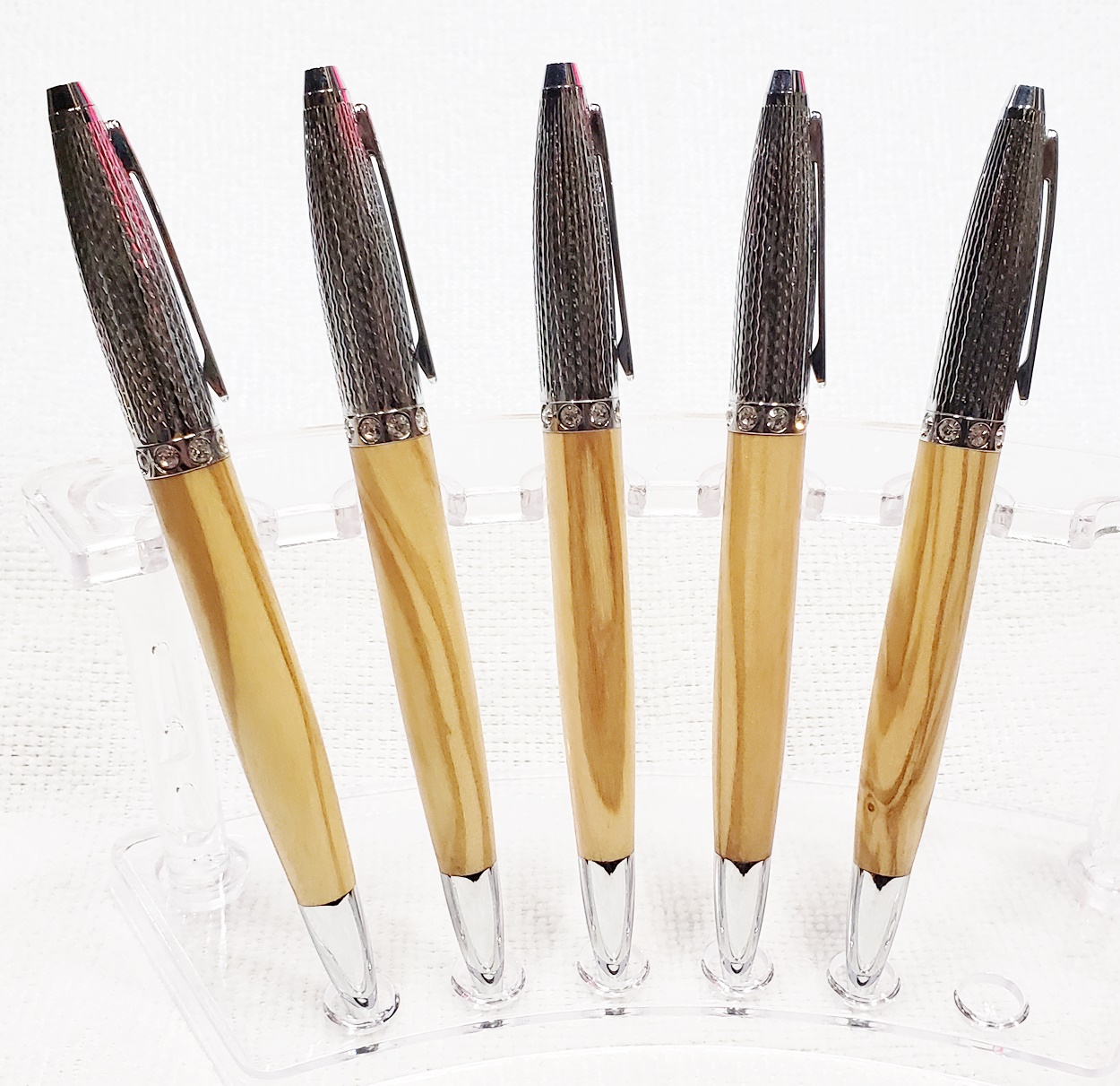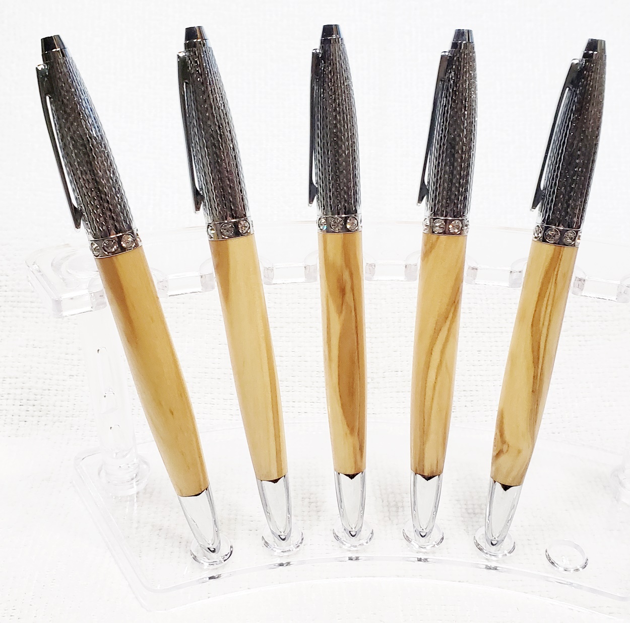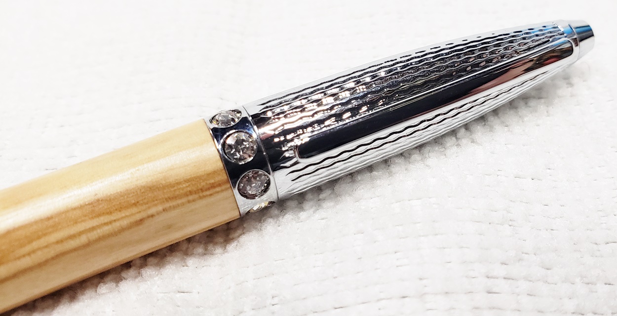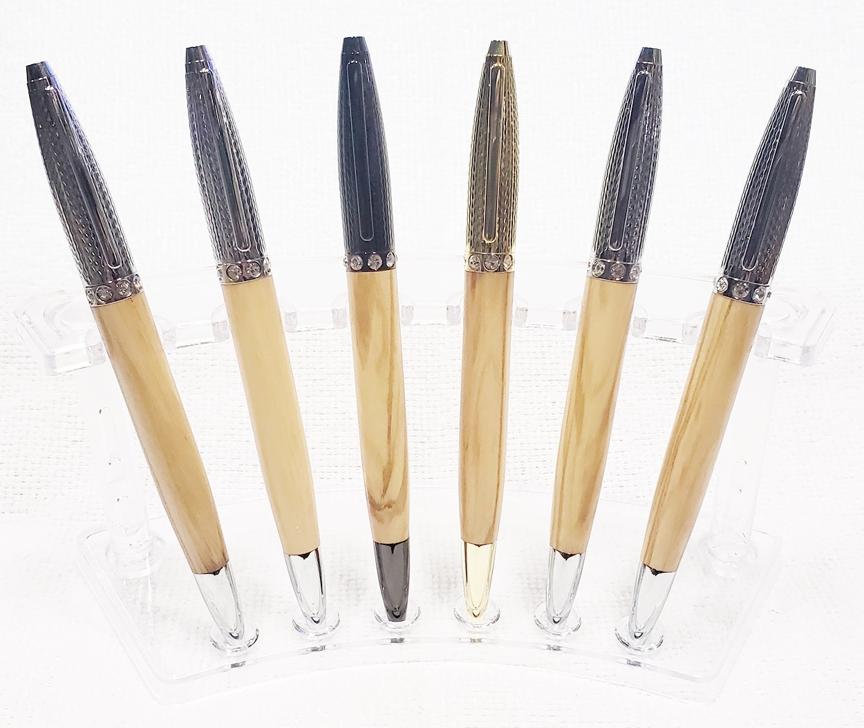 These are Marchesa pens from Crooked Mill, 11 of them. All are chrome, except for one gunmetal and one gold. They look to be a copy of the PSI Duchess pens. I like the crystals. The wood is Roman Olive from Woodcraft. The finish is Pens Plus. They're Christmas presents for the girls at work, I'm getting an early start. Now I have to engrave all of them.