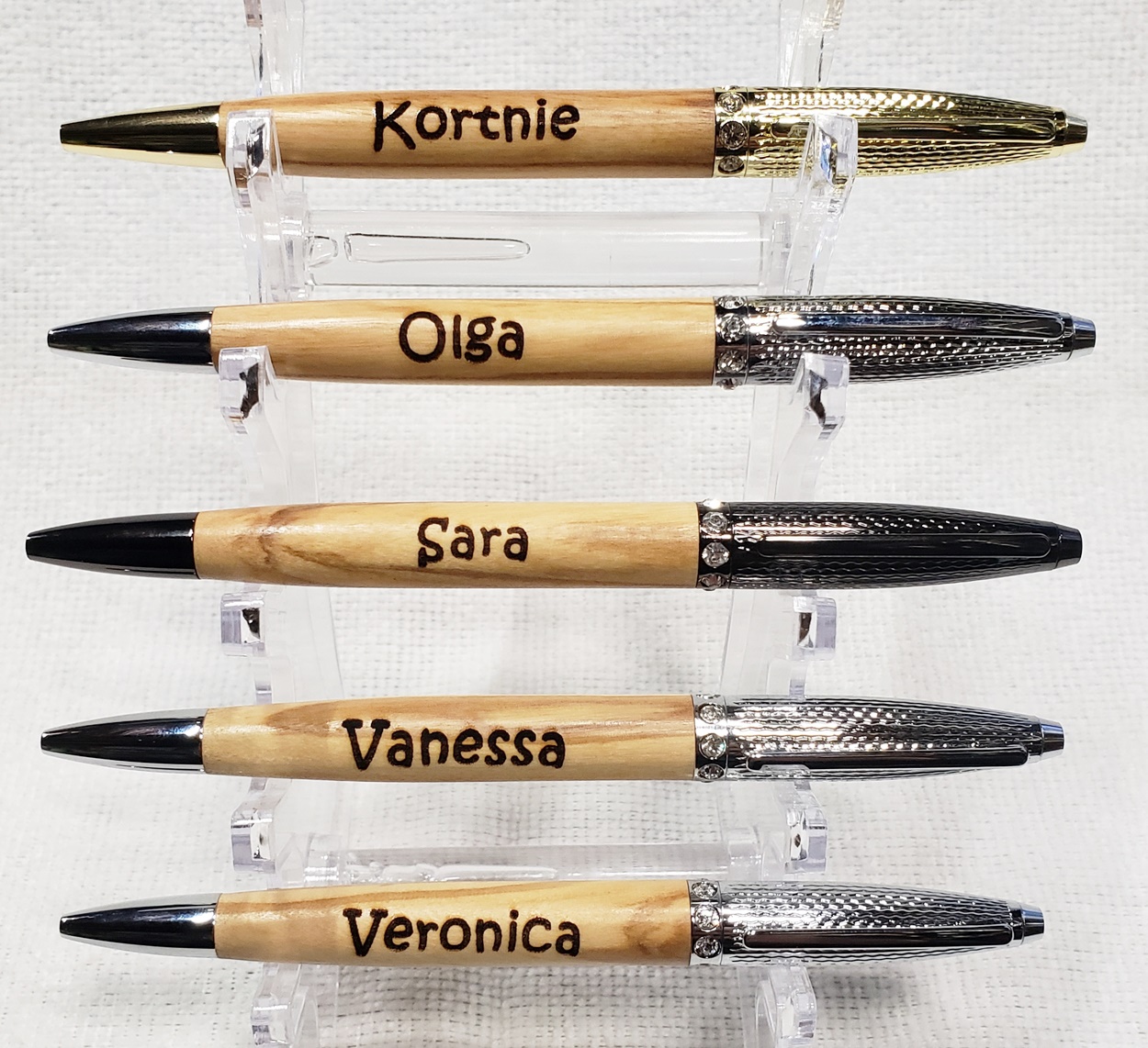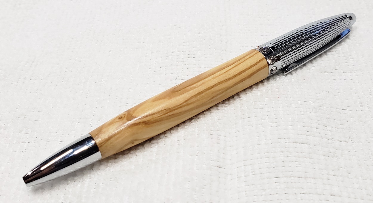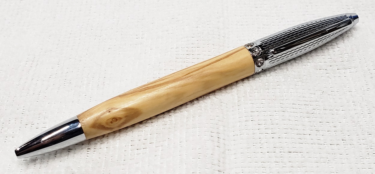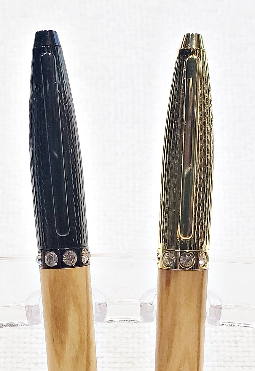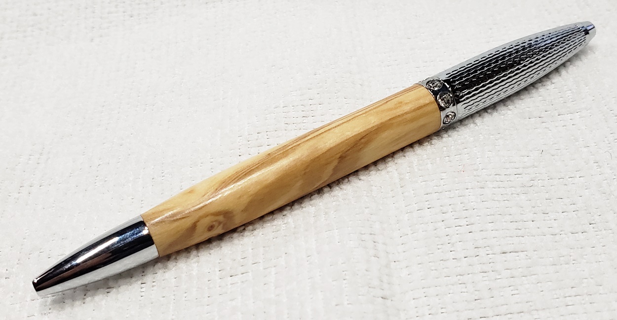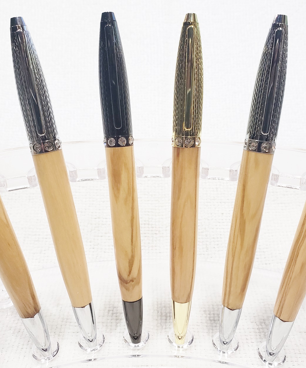 These are Marchesa pens from Crooked Mill, 11 of them. All are chrome, except for one gunmetal and one gold. They look to be a copy of the PSI Duchess pens. I like the crystals. The wood is Roman Olive from Woodcraft. The finish is Pens Plus. They're Christmas presents for the girls at work, I'm getting an early start. Now I have to engrave all of them.
