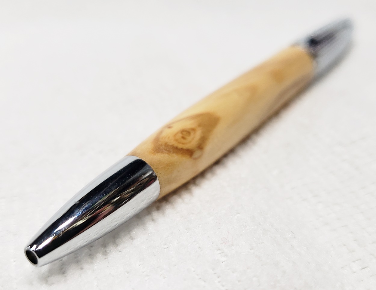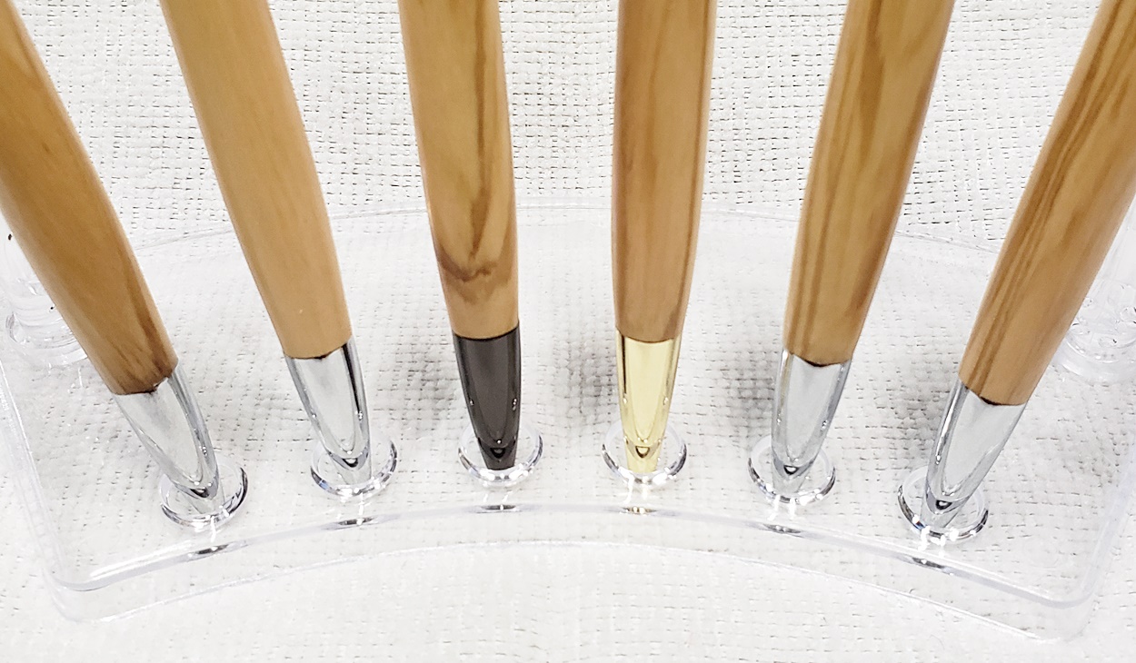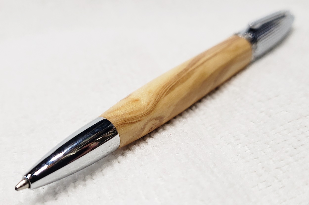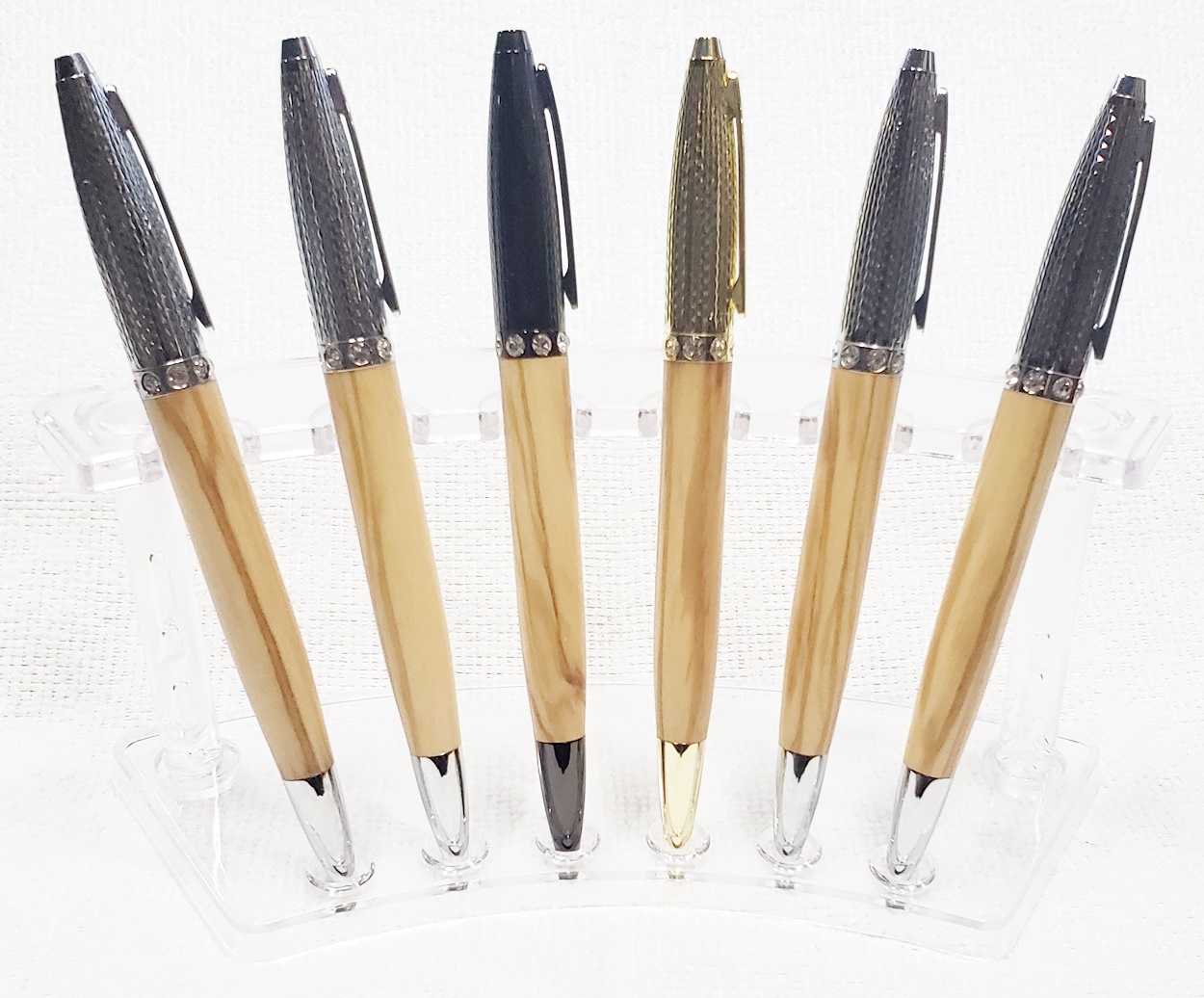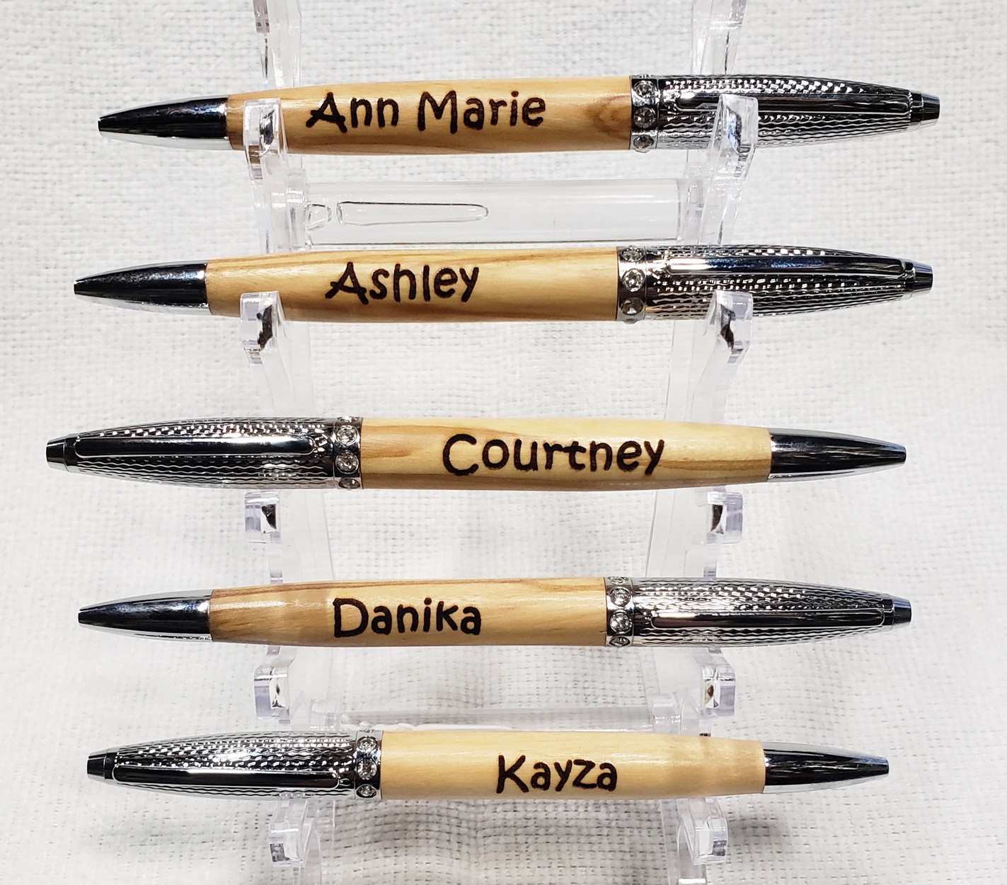 These are Marchesa pens from Crooked Mill, 11 of them. All are chrome, except for one gunmetal and one gold. They look to be a copy of the PSI Duchess pens. I like the crystals. The wood is Roman Olive from Woodcraft. The finish is Pens Plus. They're Christmas presents for the girls at work, I'm getting an early start. Now I have to engrave all of them.