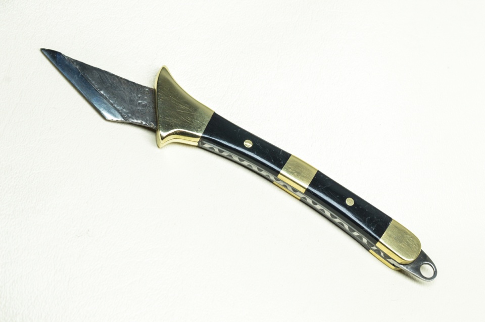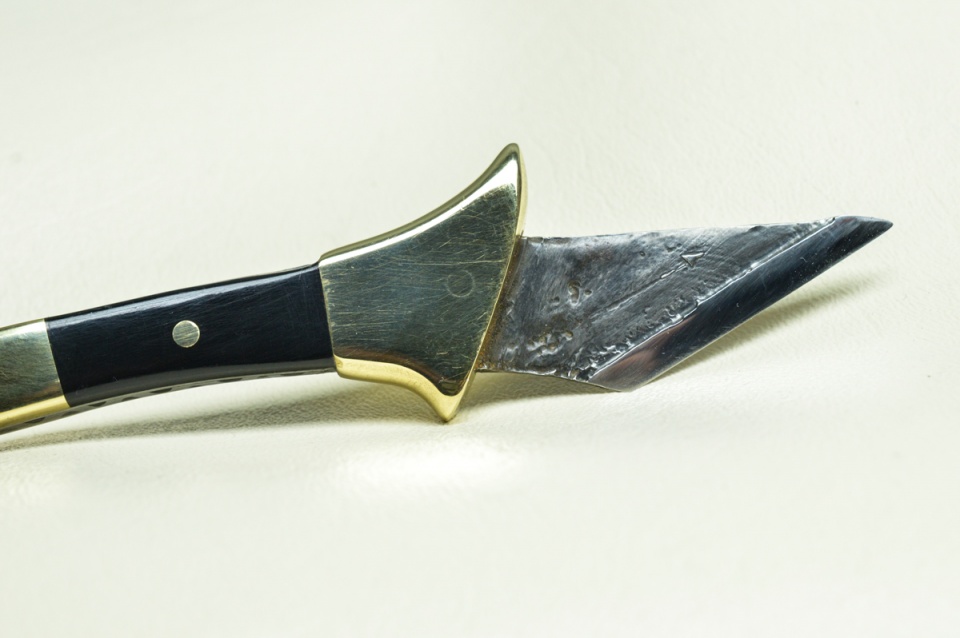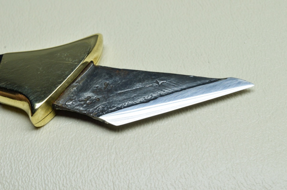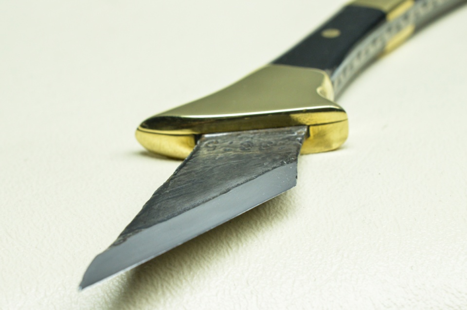 I just made this knife out of 01 tool steel. The guard and bolsters are made of brass, and the scales are made of resin that I had cast. The only part of the knife that was hardened was the beveled edge.