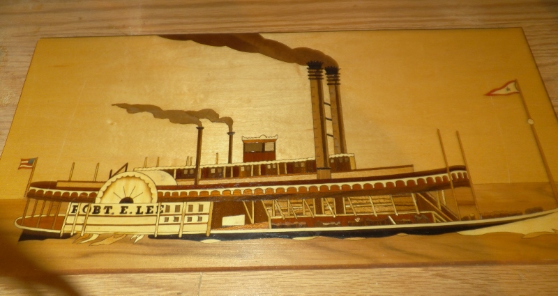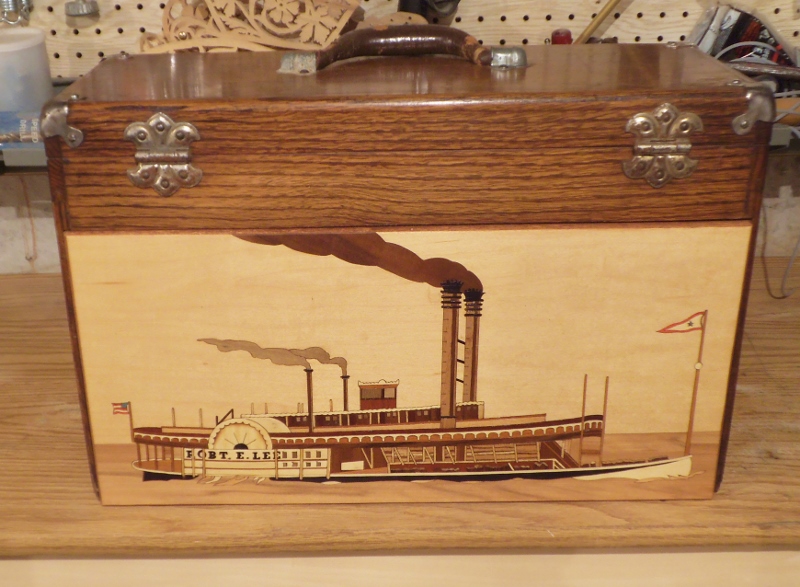 This is an old Craftsman tool box from the 1950's that I have just finished restoring. The finish and fittings are original, as are the felt drawer liners and mirror, just cleaned up a little. The back panel was beyond saving, so I put together this Marquetry panel of the Robert E Lee to replace it. These small tool chests make an excellent storage place for lathe chucks and related parts, as well as pen parts or finished pens. A newer model can be purchased from Harbor Freight for around $75 with coupon.