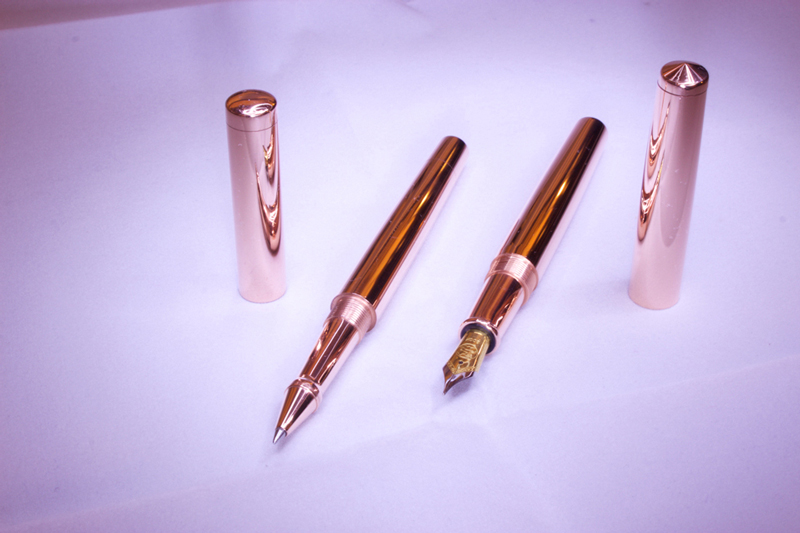 Matching Kitless Fountain Pen and Roller Ball Made from Solid Copper rod. Boring and threading done on my South Bend 9a metal lathe.... Shaping, Sanding and polishing done on my wood lathe