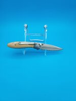 I posted a photo of a pen I completed recently that was a gift for my sister in law who lost a pen I made for her in a fire. Well, this is for her husband, my brother in law. His knife was also destroyed in the fire. The wood on the replacement knife is Toyon. Never used this wood before and it is very hard but cuts like butter on the band saw. I've also included a photo of the original knife which was made from Manzanita that existed, at one time, on their property. I think the Manzanita knife was probably one of nicest looking knives I've ever made.