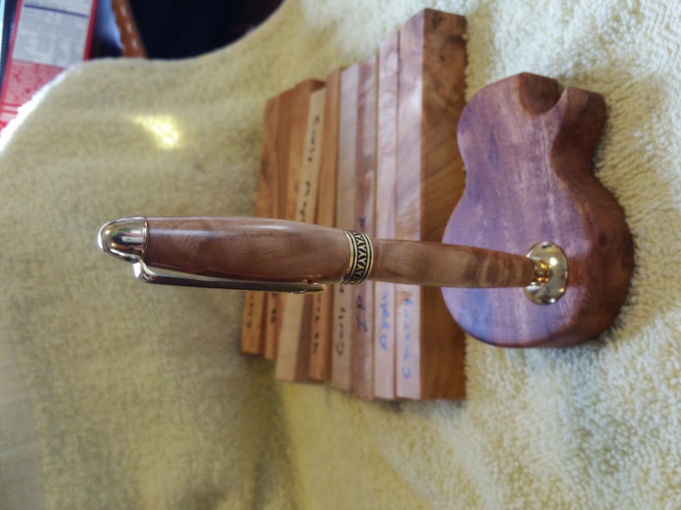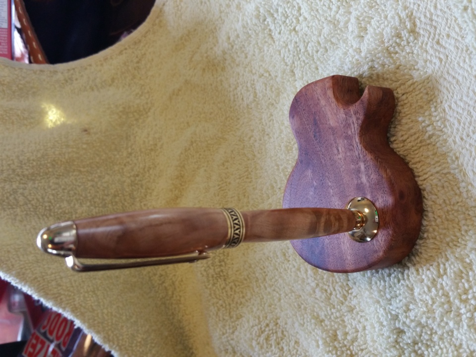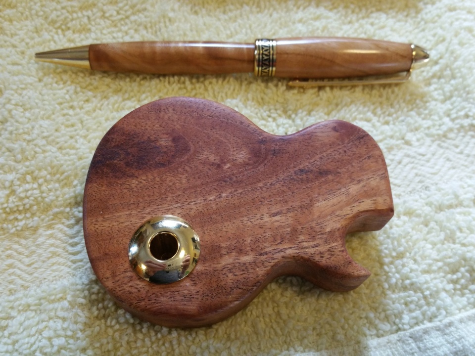 It is created from Cherry Burl and has a flawless finish. The kit is a 10 K Artisan European and really complements the cherry. Nedge also made a guitar-body shaped base from the same cherry burl that is stunning.