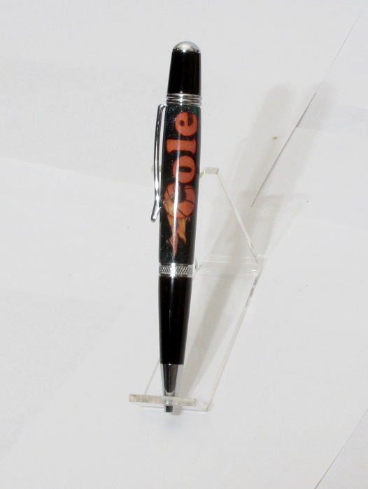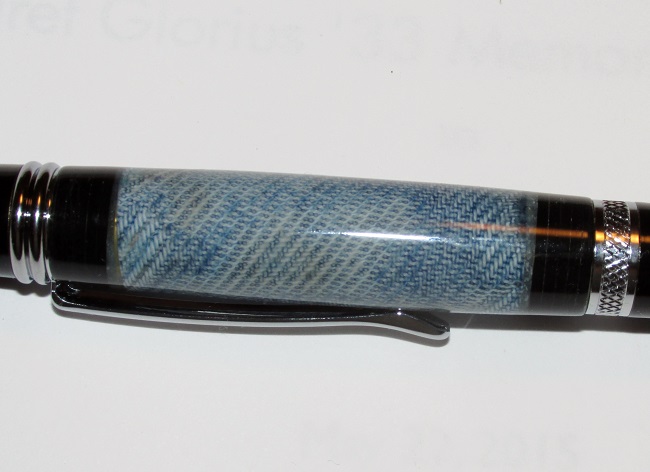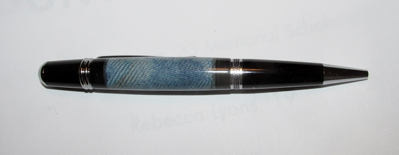 Made from a pair of old blue jeans and the black ends are layers of an old record. So along with the "entertainment" theme, this pen could represent most any song in country music. There have also been a couple songs titled "Blue Jeans" - my memory tells me there was one by Stevie Nicks - but I might be wrong about that.