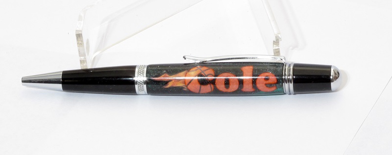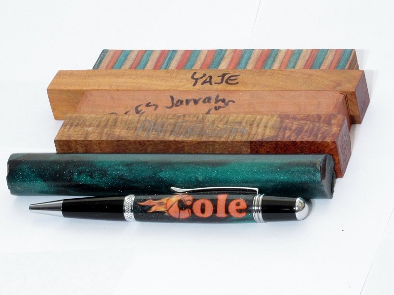 My son Cole received an awesome pen from Dylan (son of Mike4066). It is made from a blank that they cast with a custom decal - his name, some flames, and the "C" is a basketball (Cole's favorite sport). He REALLY likes this pen. It also came with some nice blanks that Cole has added to his collection - including one identical to the one they used making the pen and some really nice wood blanks.