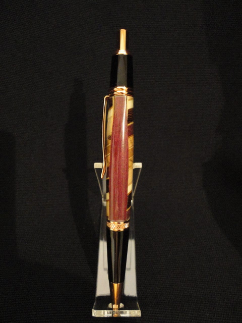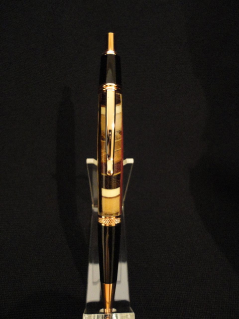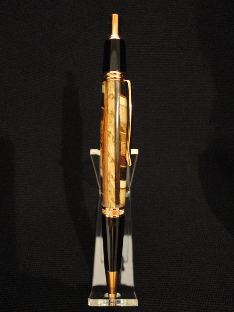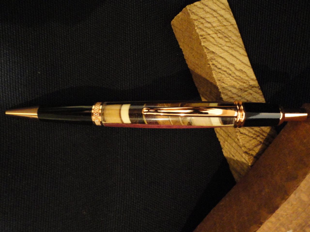 I received my PITH pen from Notscottish, Peter on Wednesday and it is a very nice pen! Thank you very much! I love the copper kit combined with variety of darker and lighter colors in the blank and depth of colors under the finish which is several coats of CA glue. The pen was pieced together out of Holly, Wengie, Black Walnut, Zebrawood, Padouk, maple, Purpleheart, and a few other types of wood. At first I thought it was a resin blank.