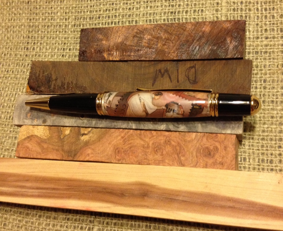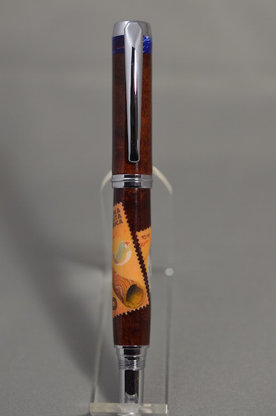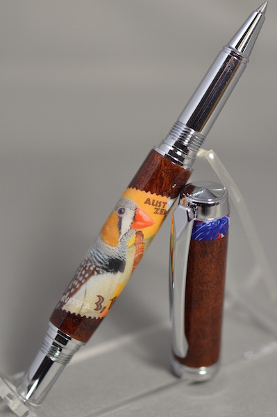 Now for this pen. It is so well done, turned from ancient Red Gum, with a Croatian postage stamp showing an Aussie Zebra Finch, and in keeping with the bird, a segment band at the top with the Aussie flag colors. Just great! And the blanks are a treasure in themselves. Here goes for the moment of truth (for the pics). Pushing the button...
