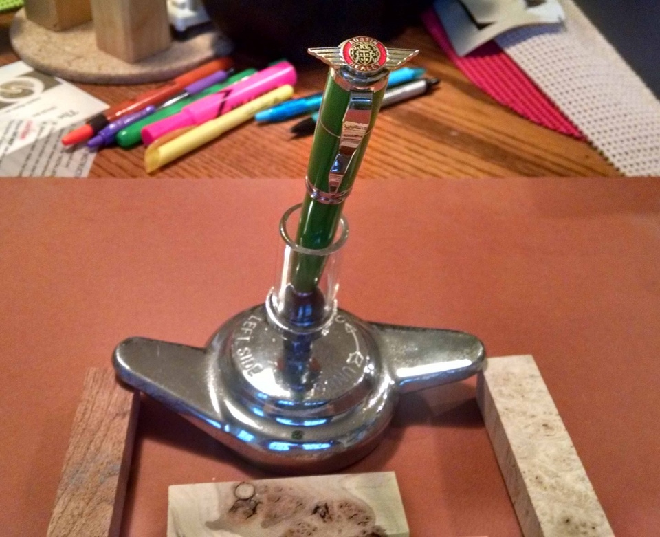 Not only did she do that, she made a desktop pen holder using a wire wheel knockoff and a vintage style glass fuel filter to hold the pen. Definitely creative and appreciated.