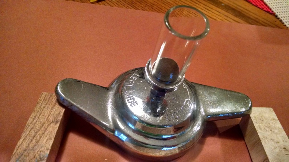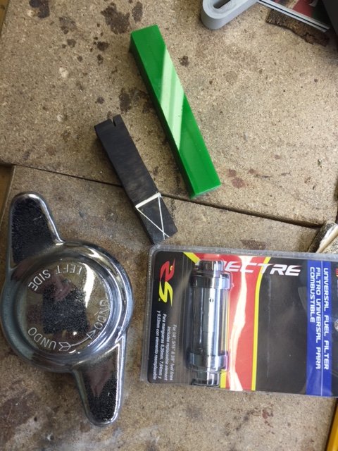 I used a sticky-sided craft foam sheet and cut out a circle for the bottom plus a small circle at the bottom of the tube for cushioning (not in this picture). The fuel filter is connected with a carriage bolt I bent and installed through a hole I drilled in the brass knockoff.