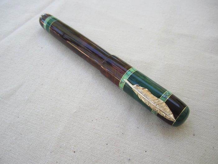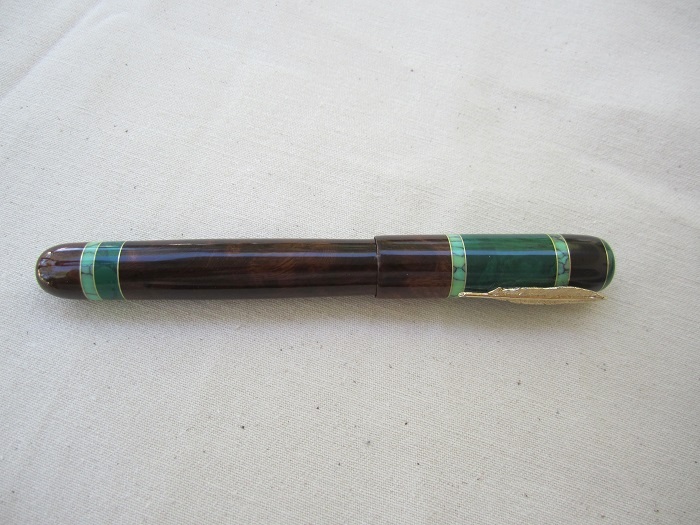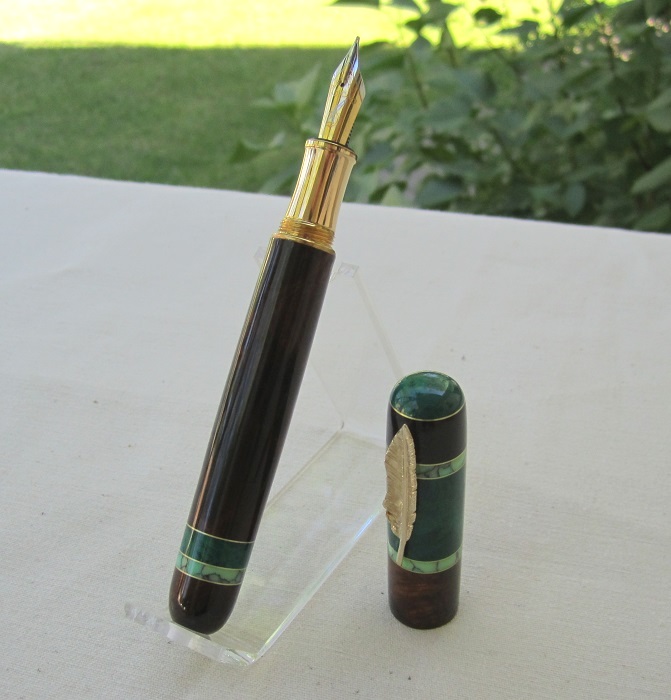 Per the information Steve included with his note, this pen is made with Desert Ironwood Burl (swirl burl). It also features Jade and Veracite Tru-stone. No clip - the roll stopper is the charm from a tie-tack and is gold plated sterling silver. The kit parts he used were from a Roman Harvest kit. And it features a Heritance Medium Nib and Schmidt K5 converter.