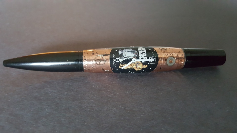 Black Ares Pen Kit - from Taylors Mirfield. Late 70's Starwars watch face on a background of copper tape.