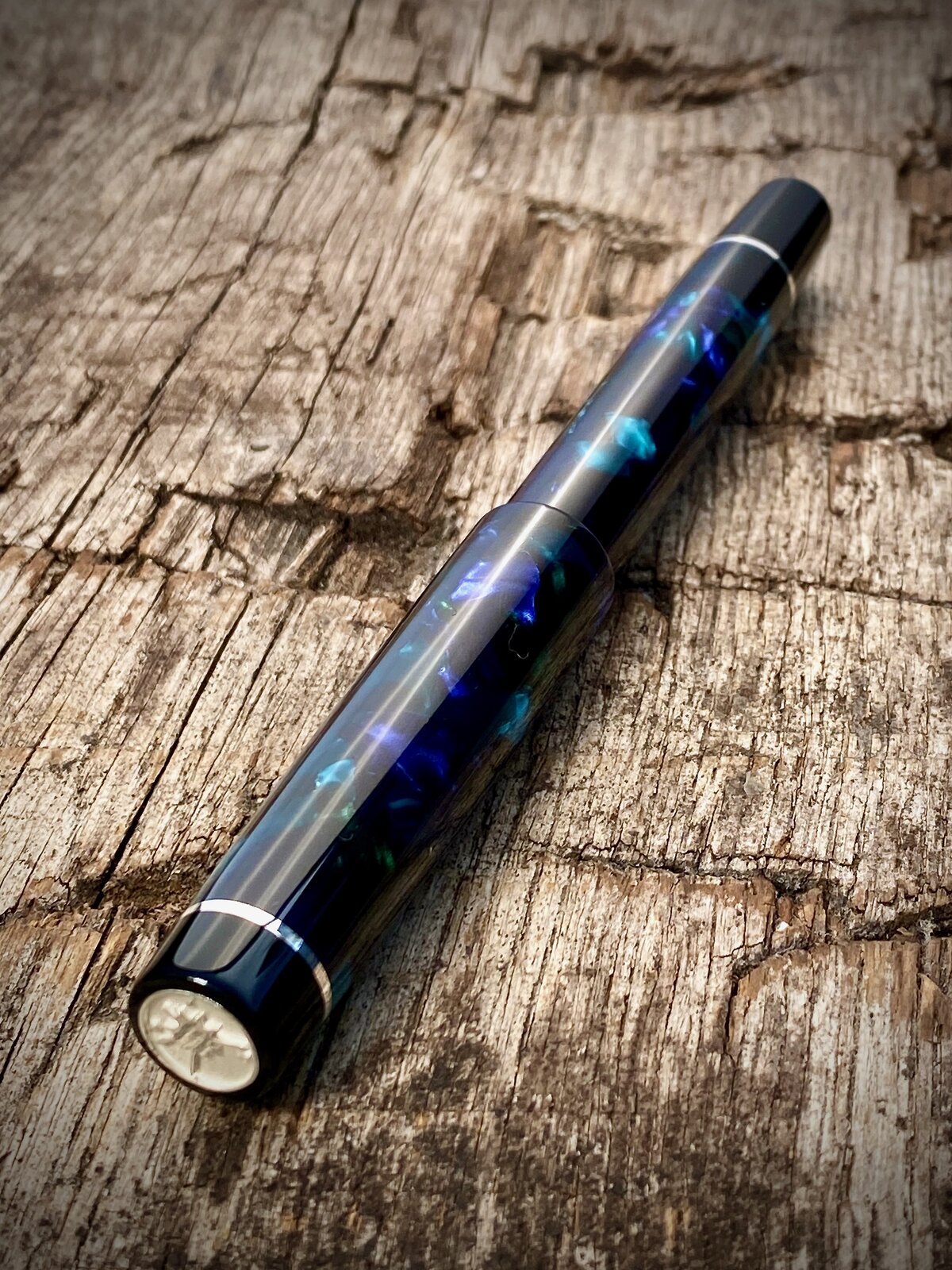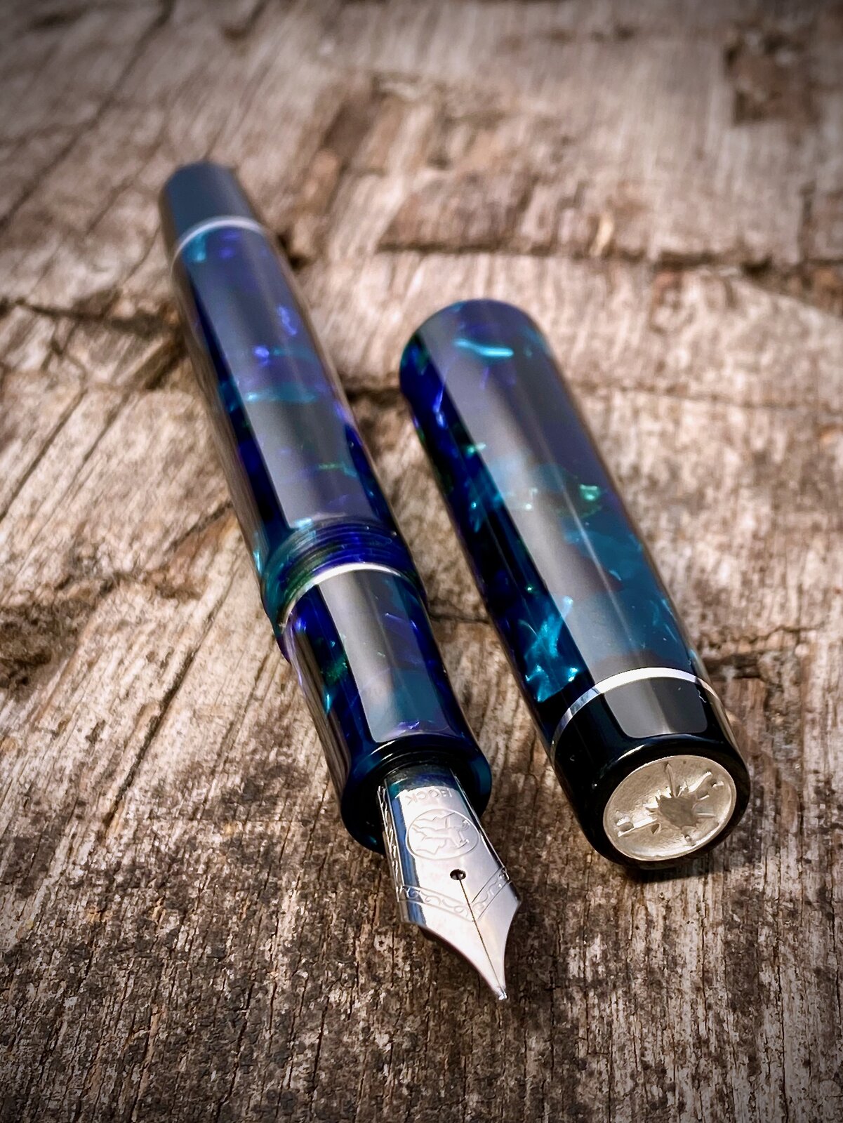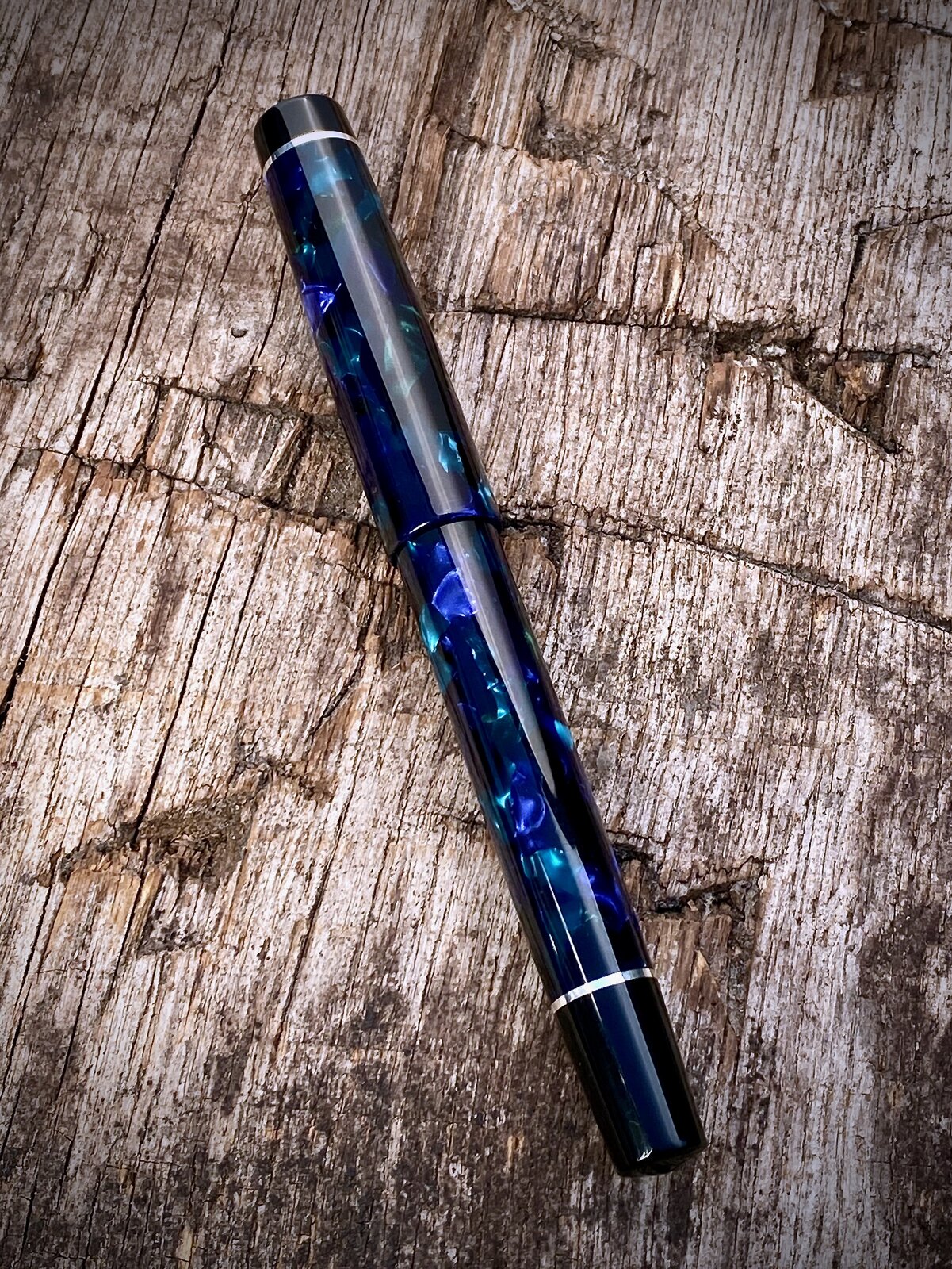 As a follow up to may previous post here is a slightly different coloured pattern in the same Mazzucchelli Ceboplast material. This one is referred to as Sapphire Dream / Sogno Zaffiro. I found out the other day that, apparently, these are not the names that the Mazzucchelli company gave to the materials, but rather a chap in the UK who made/makes pens from them started calling them these names to help distinguish between them and they've stuck. I am happy to be corrected on this if anybody knows more.