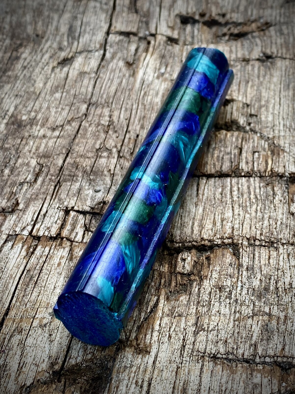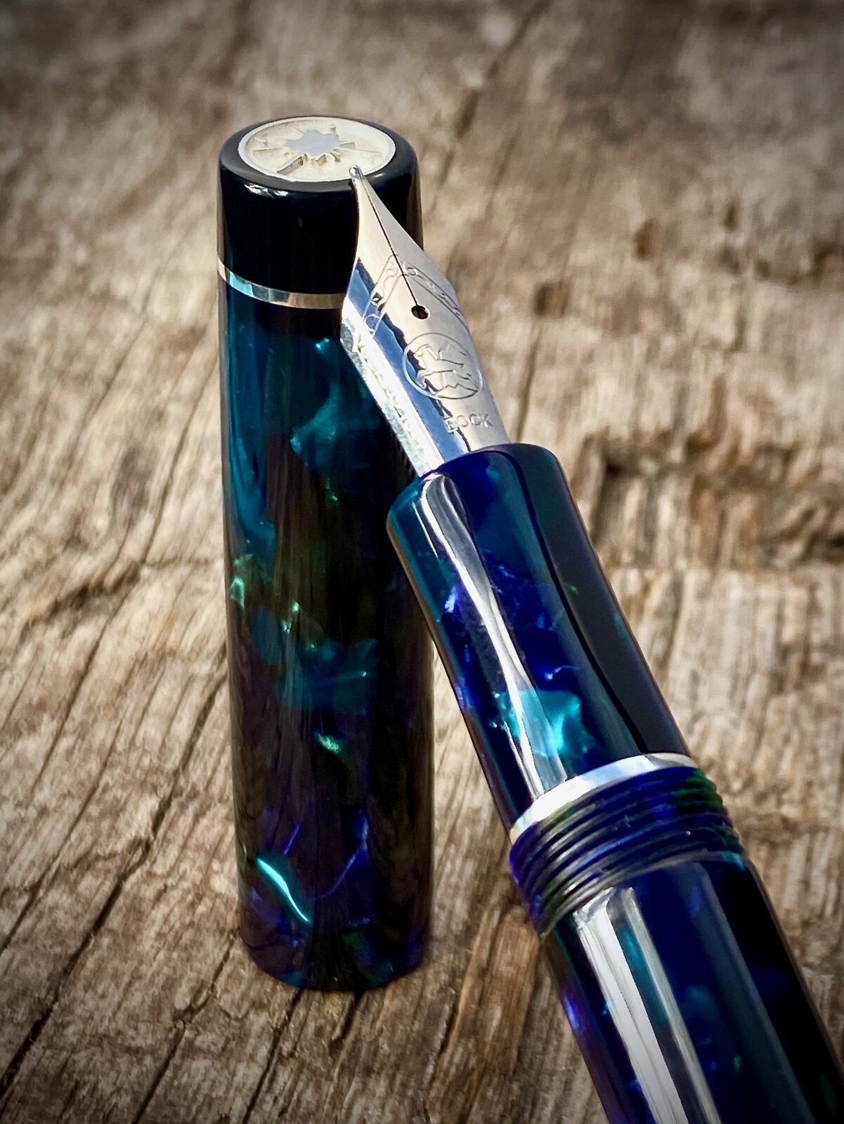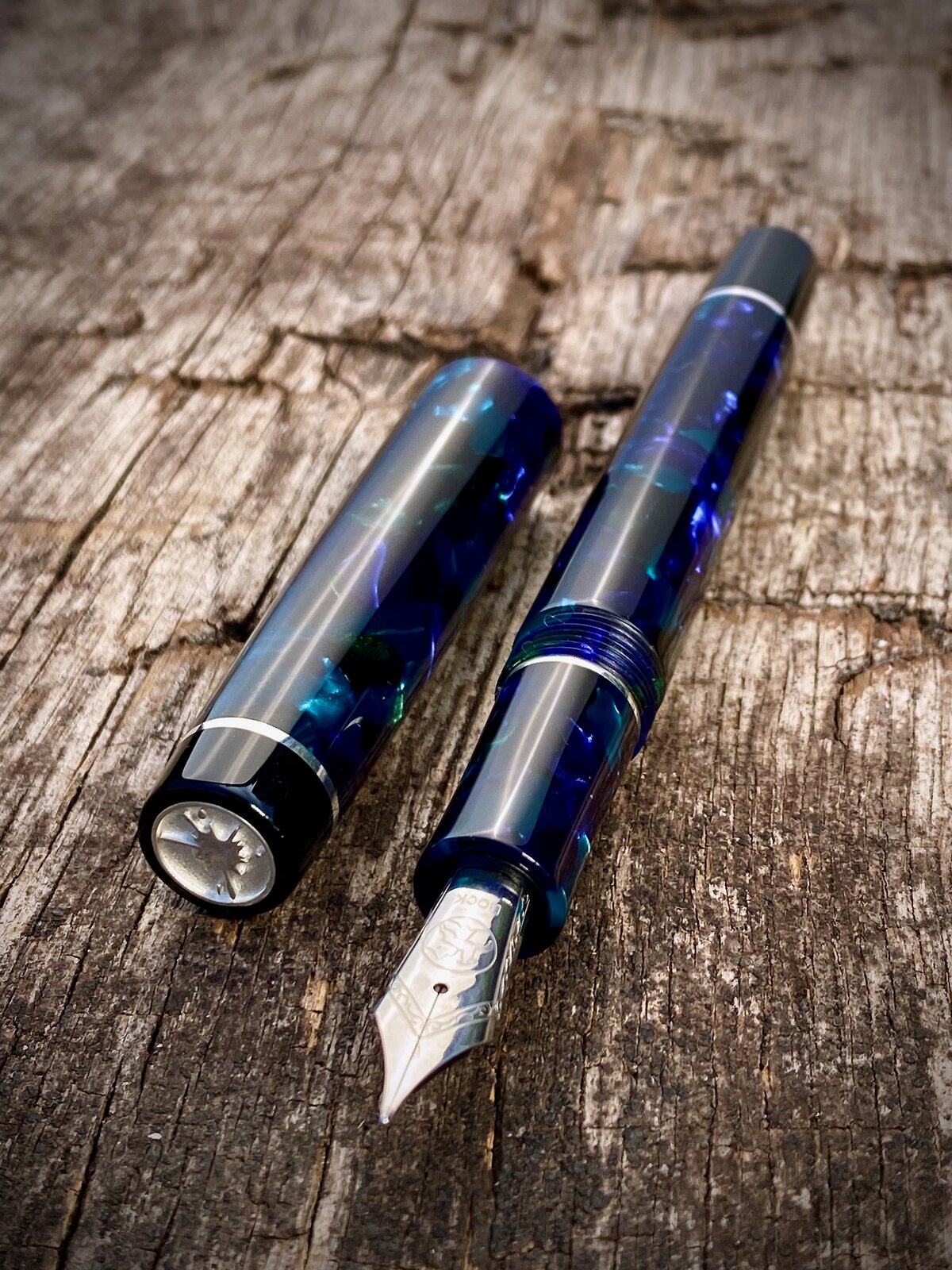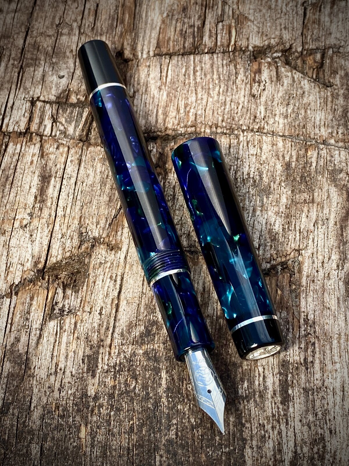 As a follow up to may previous post here is a slightly different coloured pattern in the same Mazzucchelli Ceboplast material. This one is referred to as Sapphire Dream / Sogno Zaffiro. I found out the other day that, apparently, these are not the names that the Mazzucchelli company gave to the materials, but rather a chap in the UK who made/makes pens from them started calling them these names to help distinguish between them and they've stuck. I am happy to be corrected on this if anybody knows more.