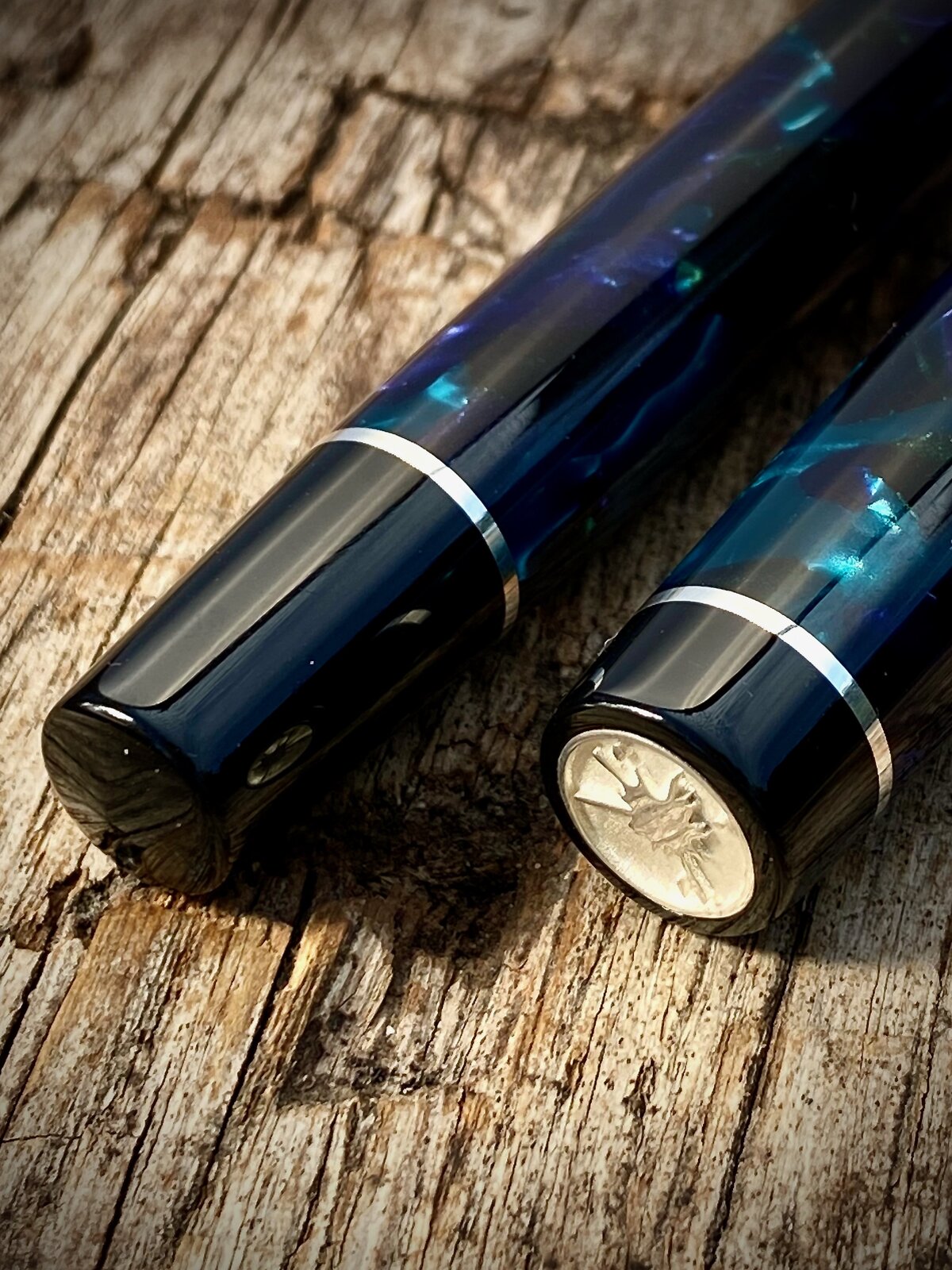 The pen has sterling silver accents, and I put these in pretty much every pen I make, including wooden ones. I cut them from silver sheet using a jewellers saw. I designed the the sterling silver coin and it is cast (not by me). The finials are black acrylic.