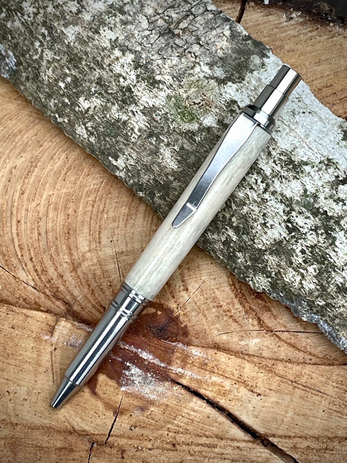 That's a sharp pen. I really like the pairing with that blank. Holly is usually a bit whiter, but the darker streaks look great with the stainless. It has to be harvested during the winter when it's dormant for the clean white pieces. The stuff I tried to dry all cracked, but I'll keep trying.