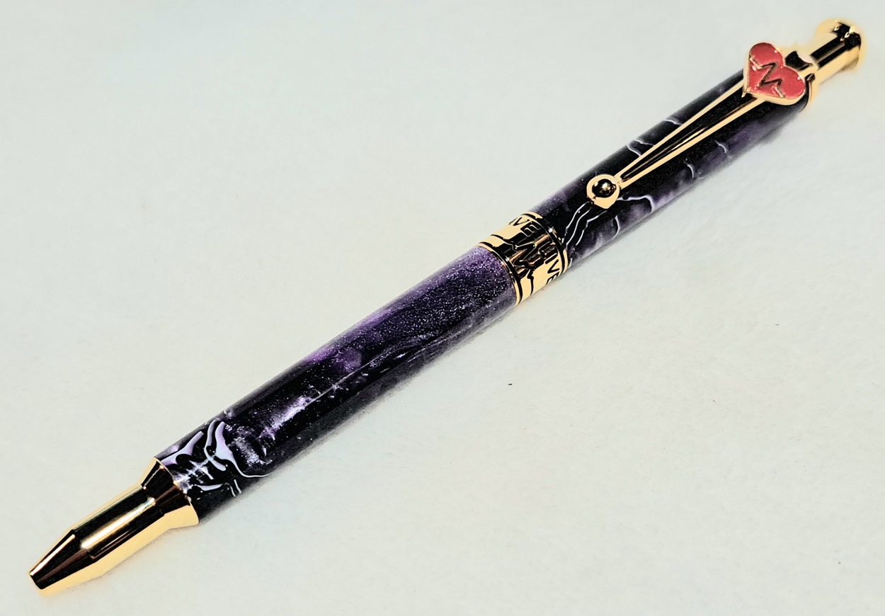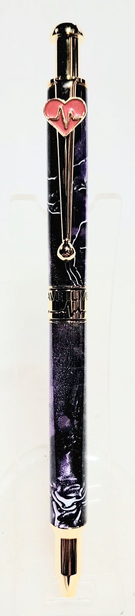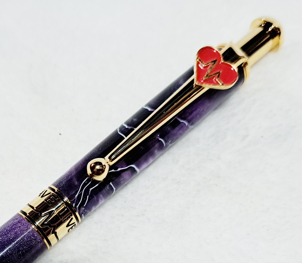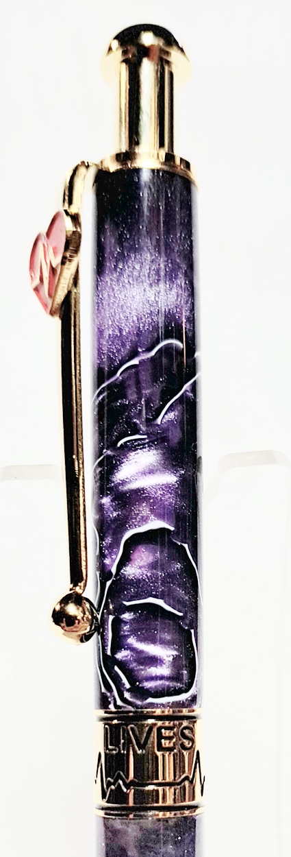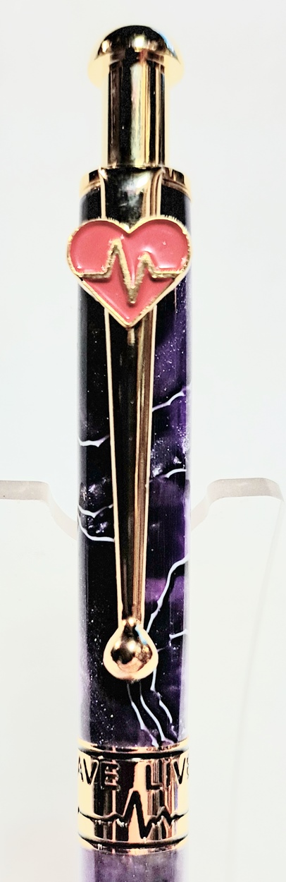 This is a Berea Medical Care click pen in gold. The blank is an acrylic acetate, also from Berea, #AA26P. I polished it with 220-600 wet; 3M Zona, all six grades wet; then Meguier's 105, 205, and 10. My daughter-in-law, who is an RN nursing student (she's already an LVN), asked me to make pens for her three instructors, one female and two male. This is for the female. The two males will get Medical Care pens in gunmetal, with wood. Made a striking pen. The center bands all say "SAVE LIVES", and have an EKG trace on them.