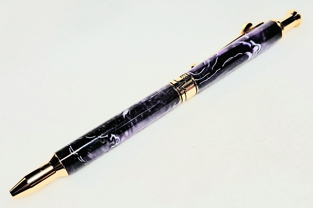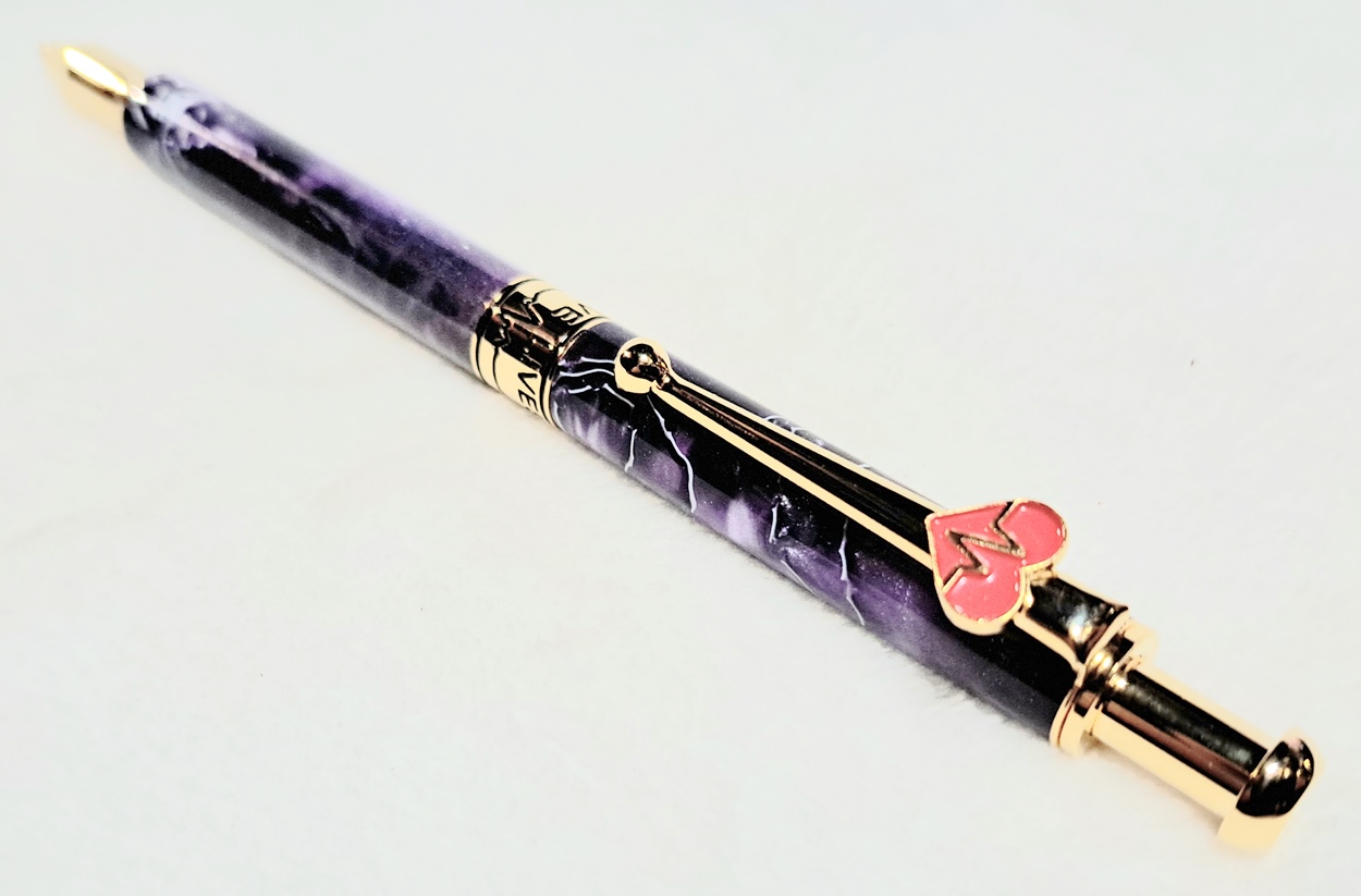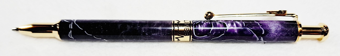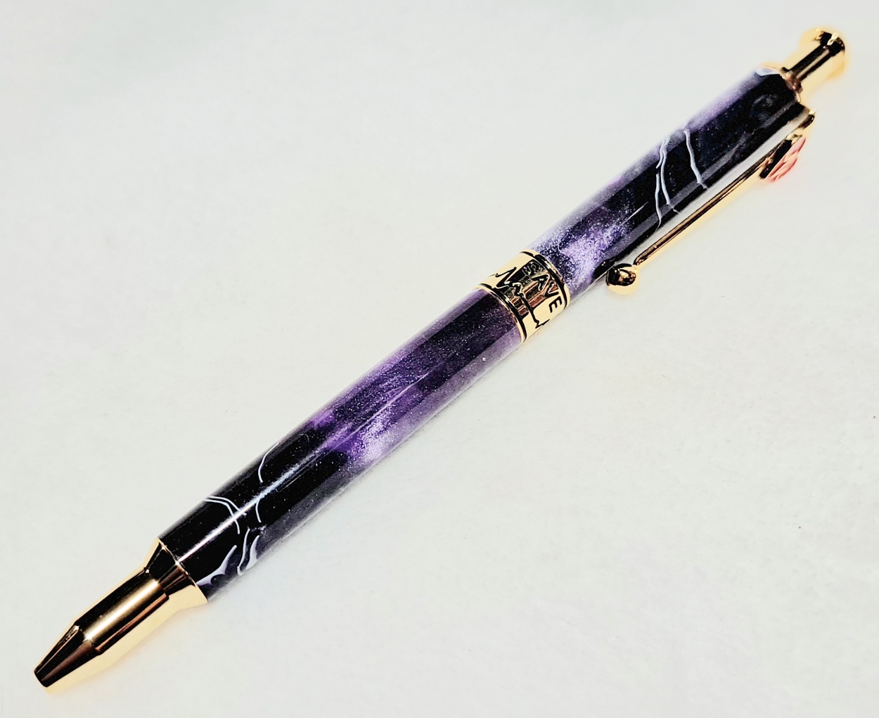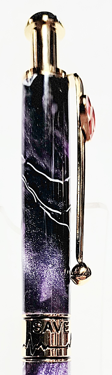 This is a Berea Medical Care click pen in gold. The blank is an acrylic acetate, also from Berea, #AA26P. I polished it with 220-600 wet; 3M Zona, all six grades wet; then Meguier's 105, 205, and 10. My daughter-in-law, who is an RN nursing student (she's already an LVN), asked me to make pens for her three instructors, one female and two male. This is for the female. The two males will get Medical Care pens in gunmetal, with wood. Made a striking pen. The center bands all say "SAVE LIVES", and have an EKG trace on them.