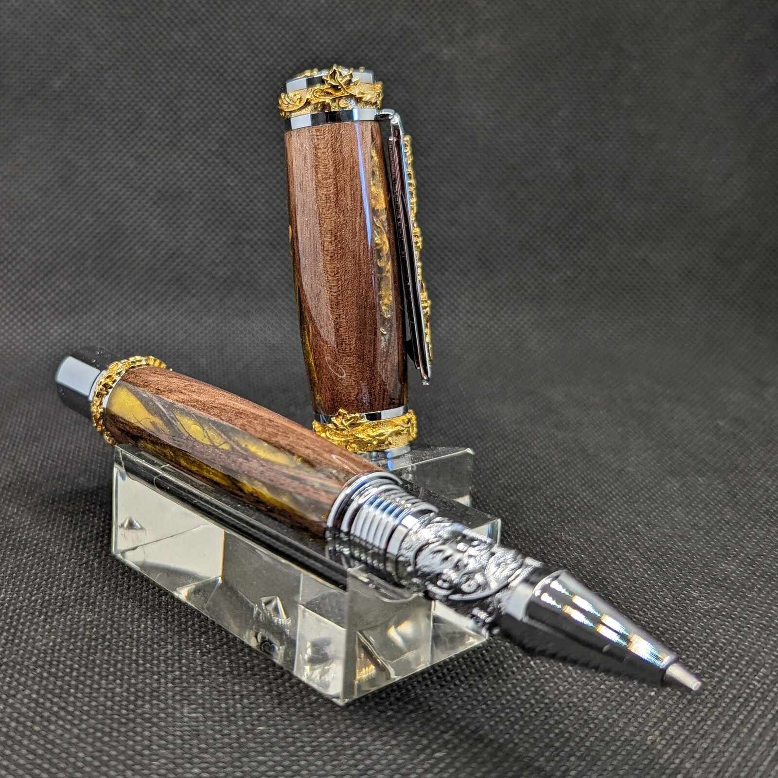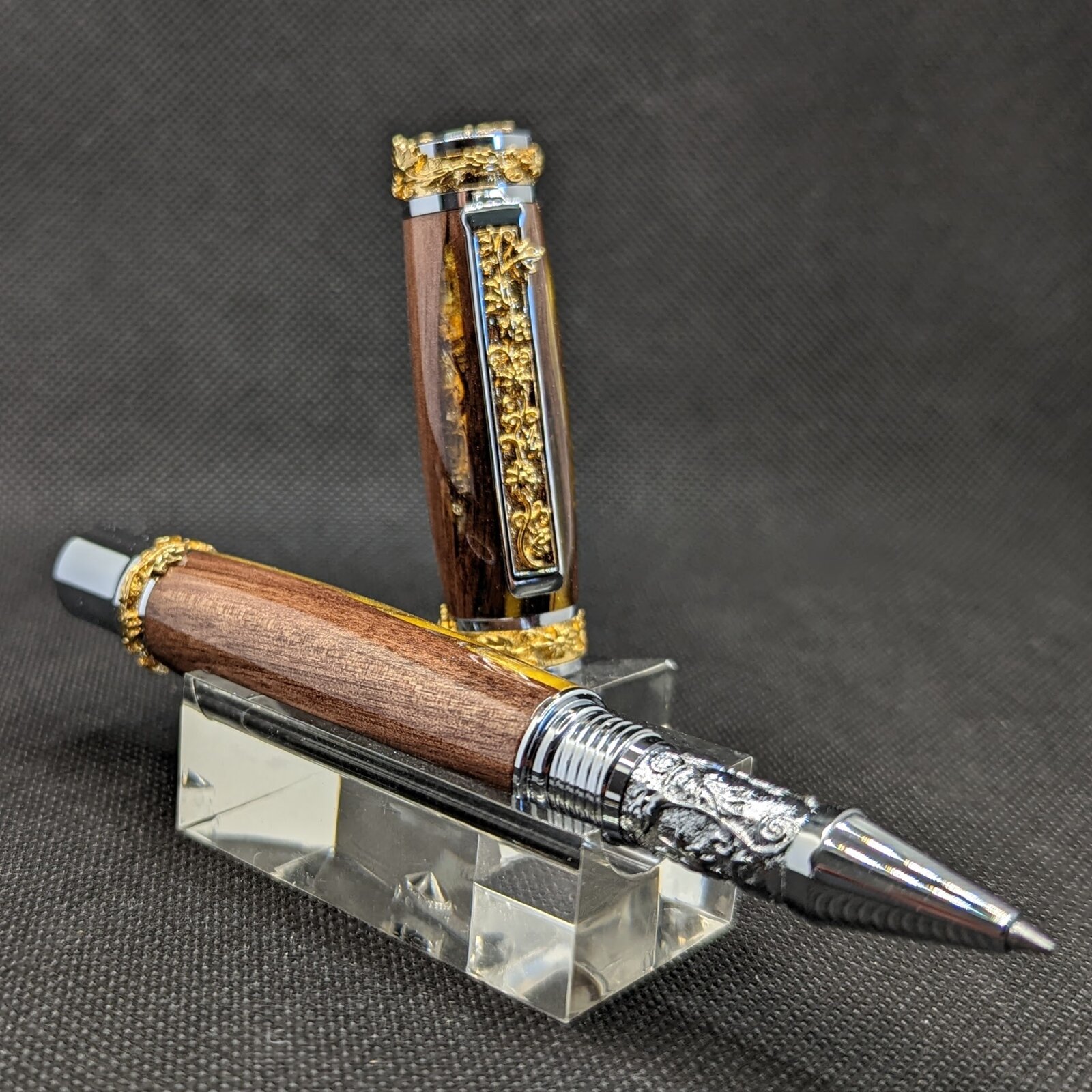 Wow, that is one heck of a pen kit! Ornate!!! The wood goes well with it, as does the alumilite inlays.