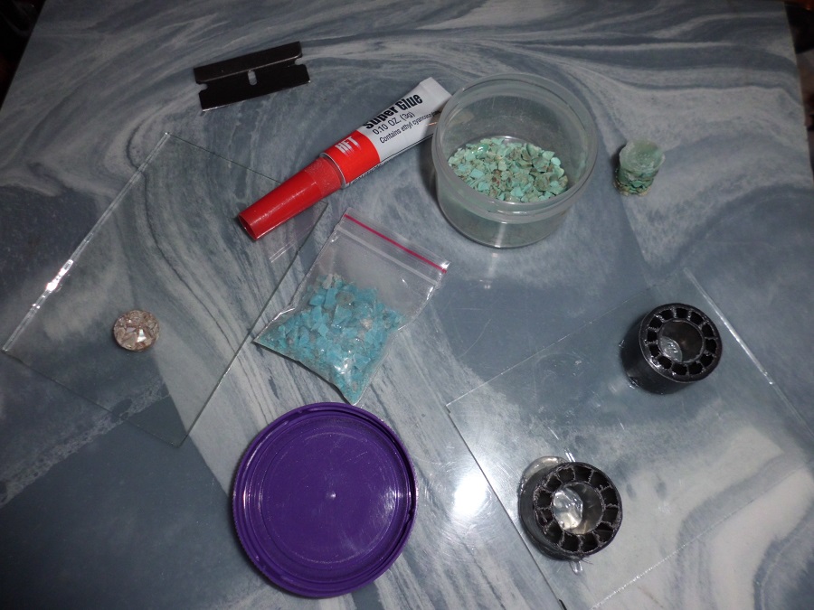 Top left is my tools for cleaning the glass "trays"... just a razor blade. The molds are sealed on the bottom with a layer of hot glue. The cleaned tray on the left next to the CA tube has half a blank on it made from the crushed abalone shell. The other half is on the lathe.