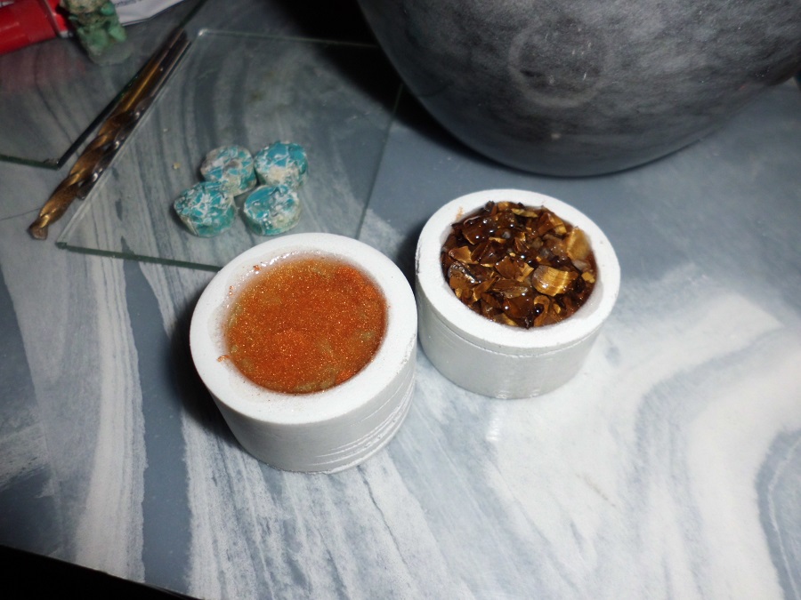 Mold on right contains: mix of gold pearl ex powder in the bottom, for hiding the bottom of the blank, and crushed Tigereye stone in the top, no pearl ex in top.
