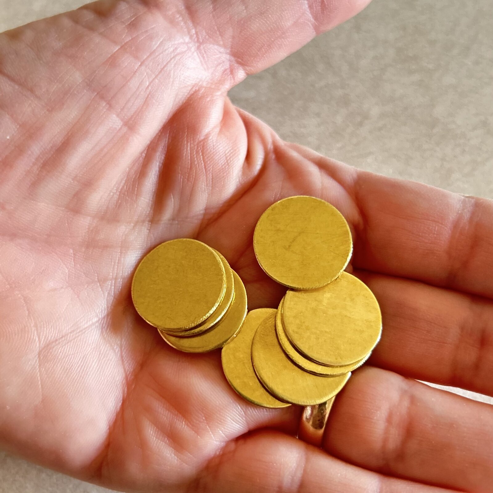I place brass sheets between 1/2" plywood plates.I screw it down all the way around. Mark out my spaces and drill with the size hole I want. Take the screws out and then cut rough round circles. That makes them deformed cutting them out, but I use a flattening hammer on an anvil to re-flaten them. Then when in a pen segment, I turn then round with a carbide insert.