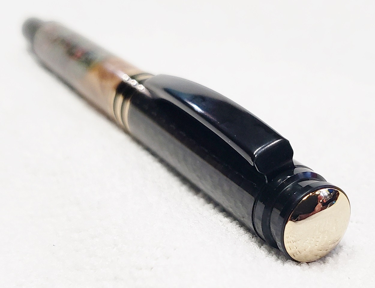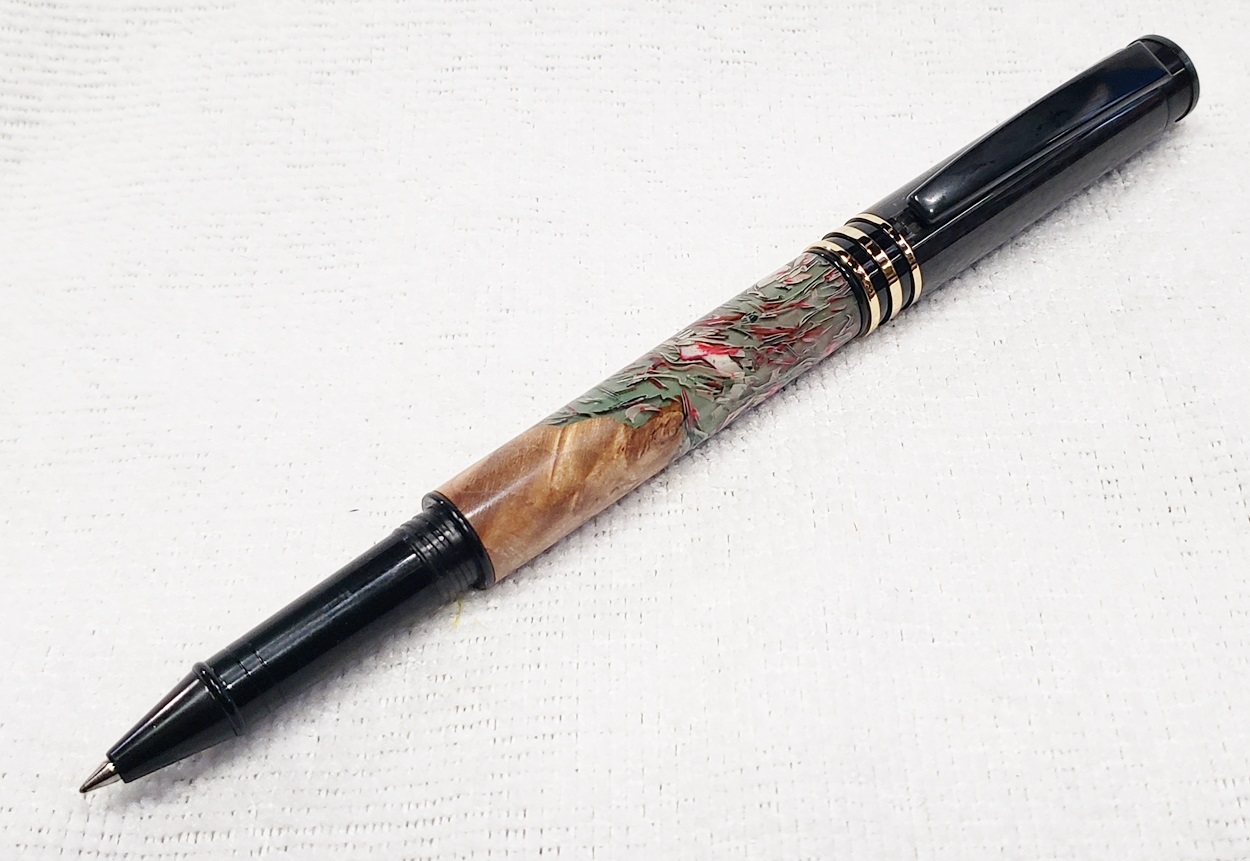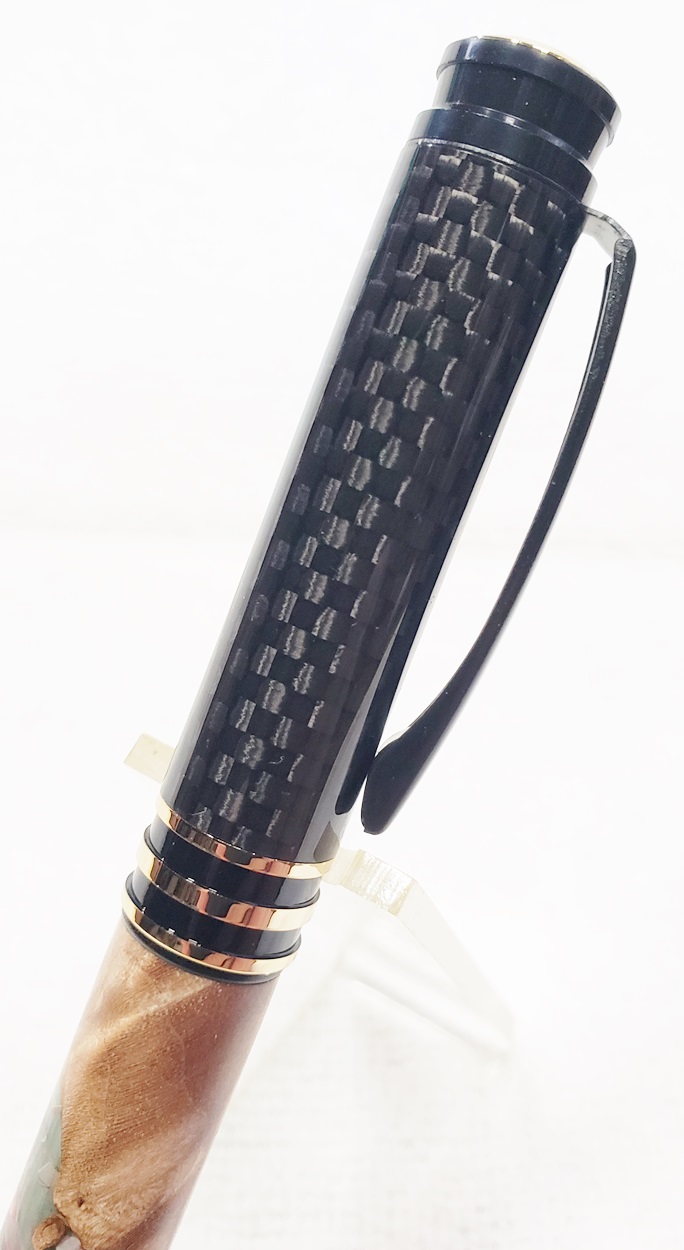 This is a new kit from Woodturningz called Metropolis, in black chrome. The blank is the other half of the Blood Money blank from Exotic Blanks, leftover from the pipe I made. The cap of the pen is carbon fiber. I think they look great together.