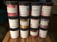 61 containers of colors, that vary from full to only a small amount left. Most are over half full. In addition to the 61 large containers, there are a variety of miscellaneous containers and some small sample packs.