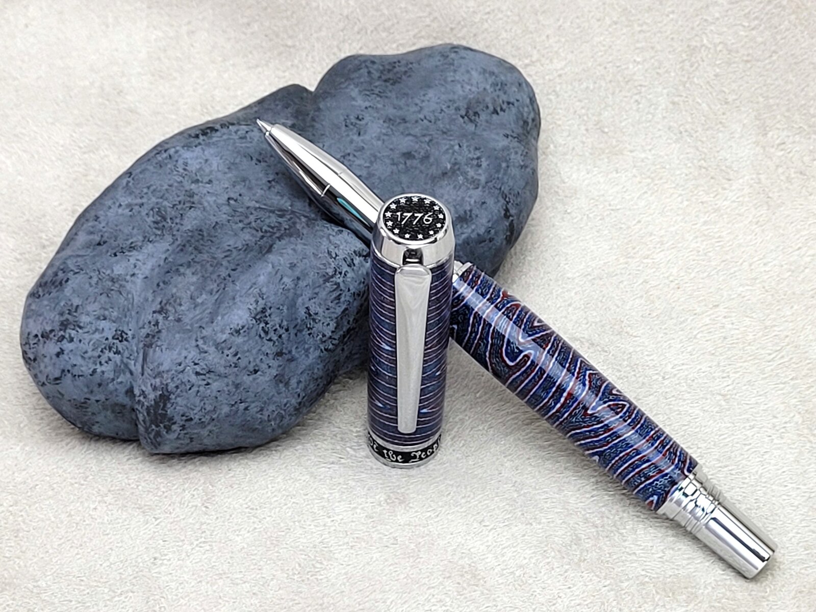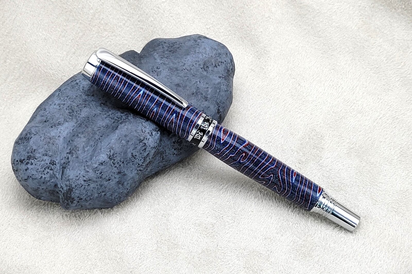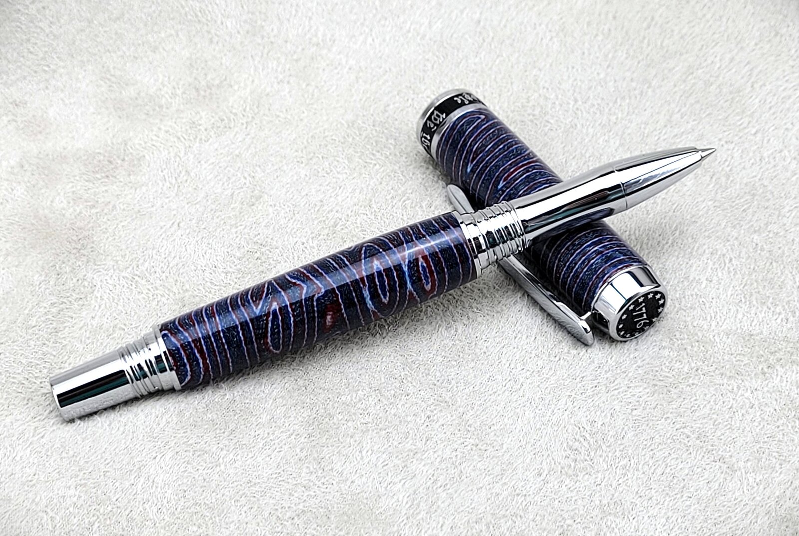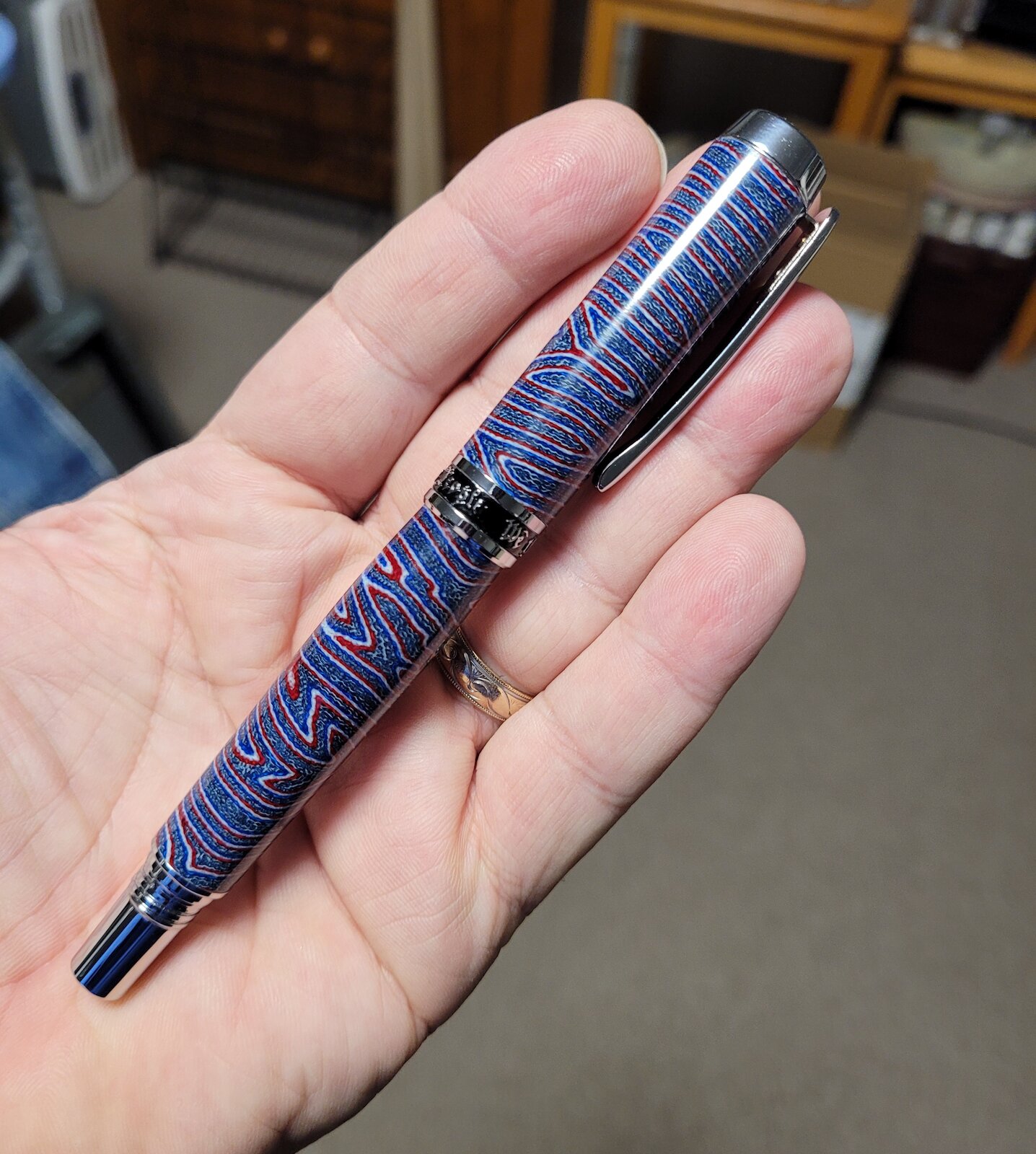 The blank and kit are both from Turner's Warehouse. The kit is their Jr. Independence in Rhodium plating. The blank was called "crazy layered" micarta. The colors don't pop well in the "posed" pictures, but picture of it in my hand shows the colors nicely.