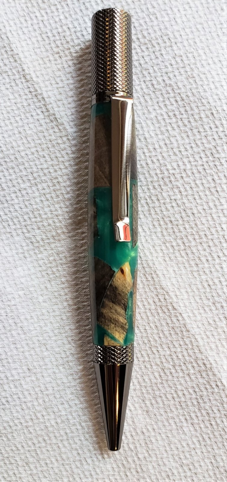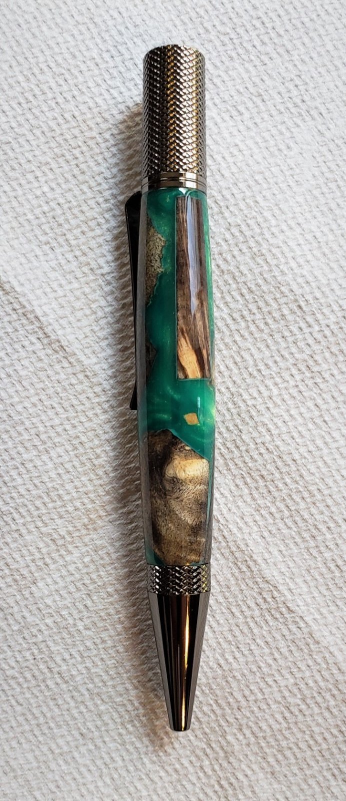 I hope I did this first one justice. Turned easily and polished very well. 2 coats of Mercury Flex thin and 8 coats of medium. I followed JT's advice and used gloves (nitrile I think, not sure what form on "plastic" he suggested) to apply the CA. I never had much success with the little bags like others do, but this worked out very well. I found I wasted less (but none being absorbed in the paper towel and I was able to apply a smoother (less textured) layer of CA which made it easier to sand. I did paint the inside of the barrel dark green.