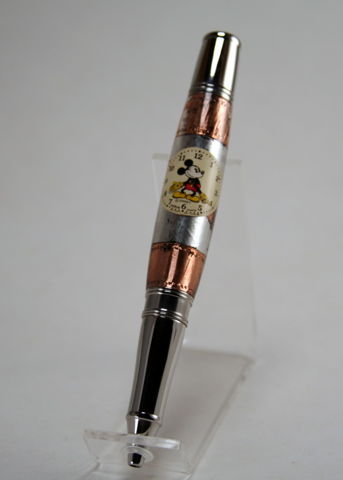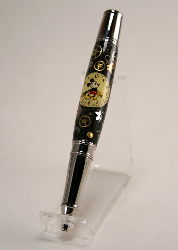 A short time ago I had a long distance special request for two Liberty style pens with Mickey Mouse. The first was for the full watch parts blank with black carbon fiber background. The second was for a specific Steam Punk version with the watch face only. Mind you, it took me a long time to sort out exactly what the customer wanted, but his English was better than my Chinese and after a bunch of backin' and forthen', we sorted it out.
