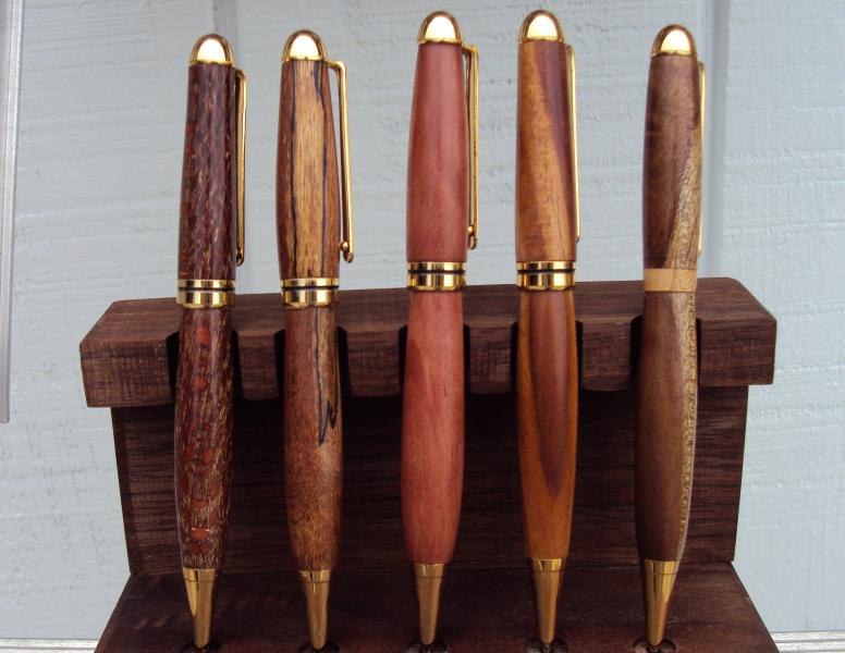 C Curt Stivison Member Joined Jan 6, 2011 Messages 24 Location Logan, Ohio May 22, 2011 #1 First I am not a photographer. Here is a group of pens I turned for the troops with kits provided by Smitty. Mac Nut, Spalted Cinnimon, Red Gum, Hilo, and Koa with a Maple band. Attachments DSC00221.jpg 56.8 KB · Views: 250