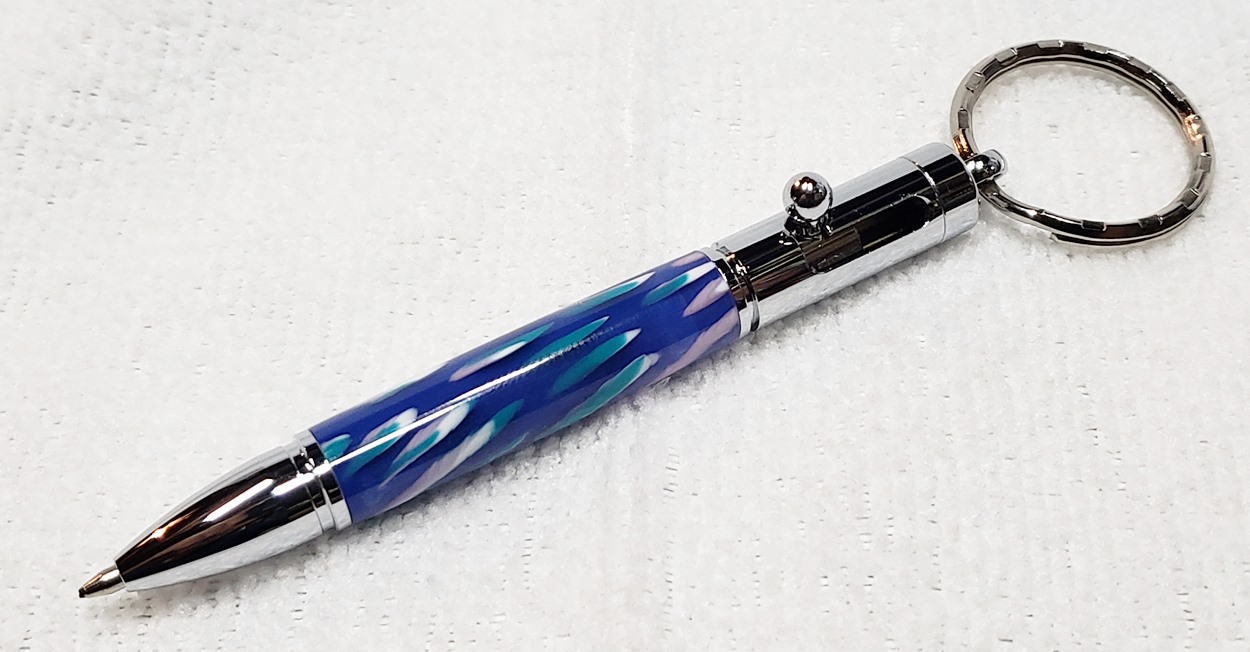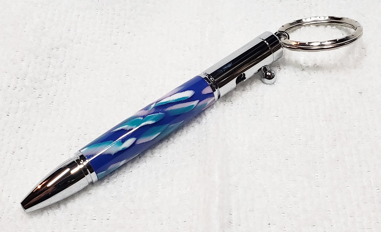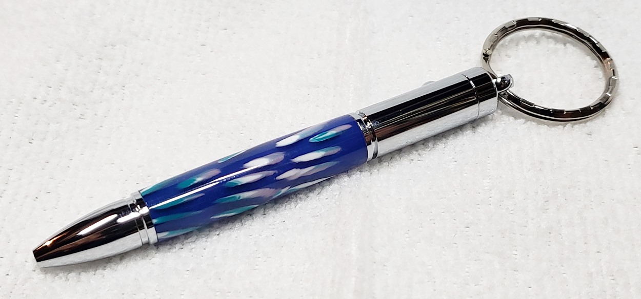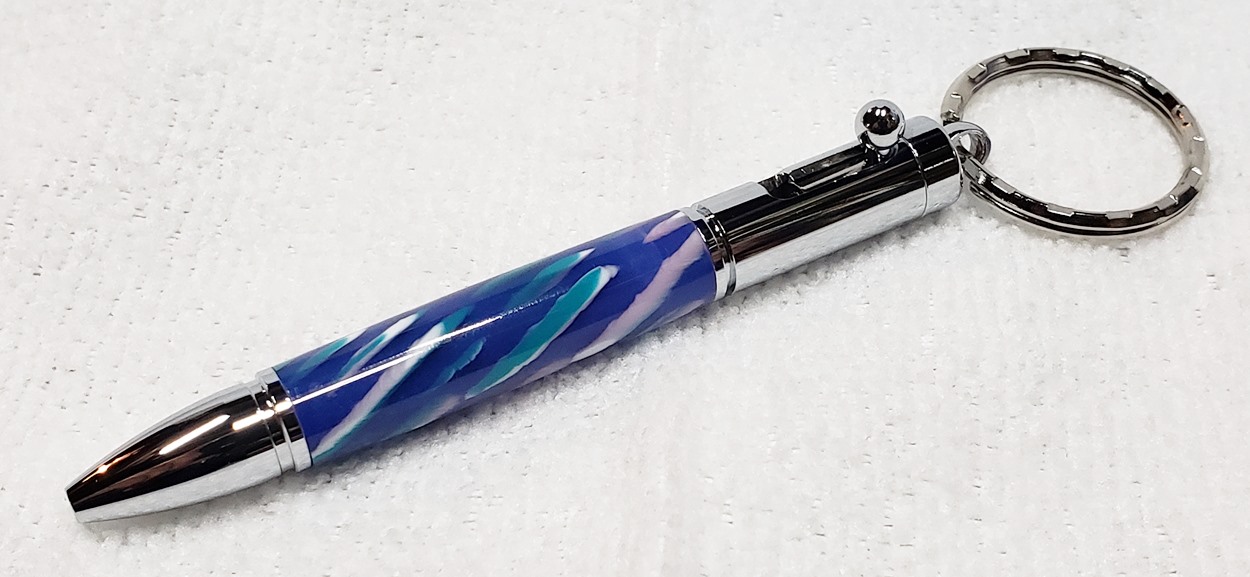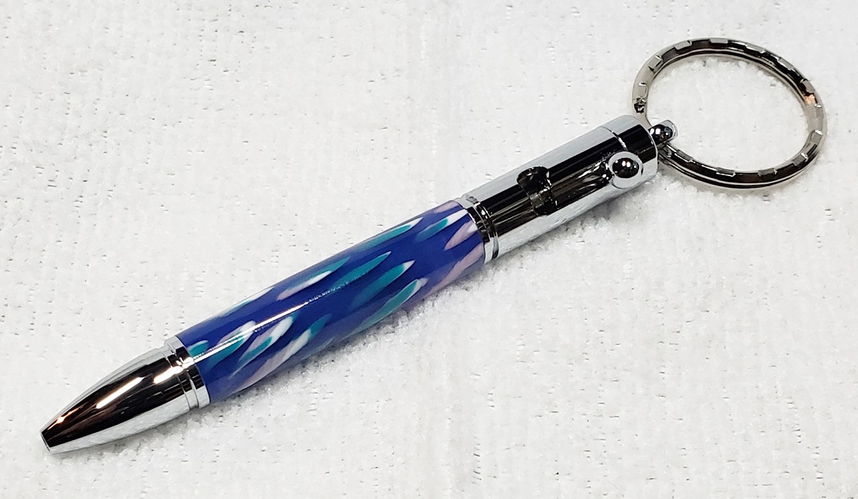 This is a new one for me. It's a Mini Bolt Action pen/keyring, in chrome, from PSI. The blank is a poly resin from Woodcraft called Urchin. Cute little thing.