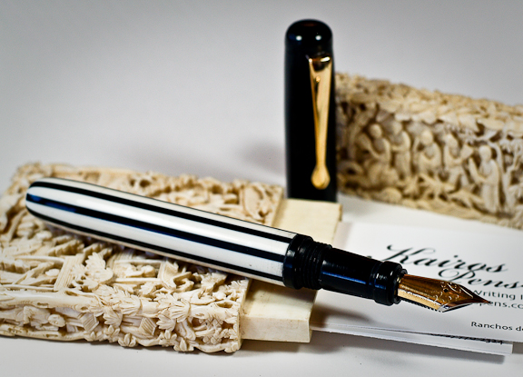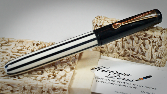My wife says it reminds her of the black and white minstrel shows she saw growing up in England. Acrylic barrel, ebonite trim and cap. Thanks for looking.