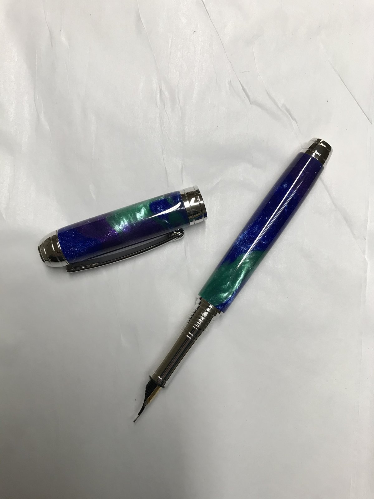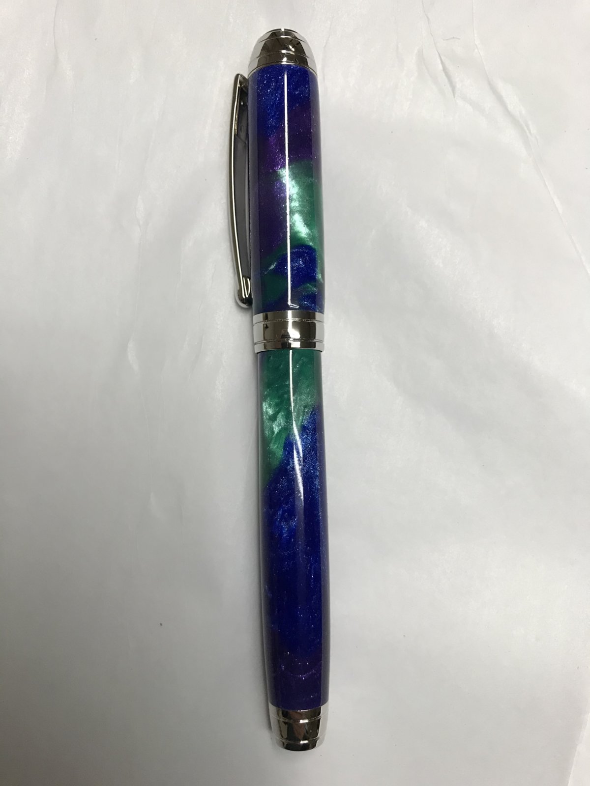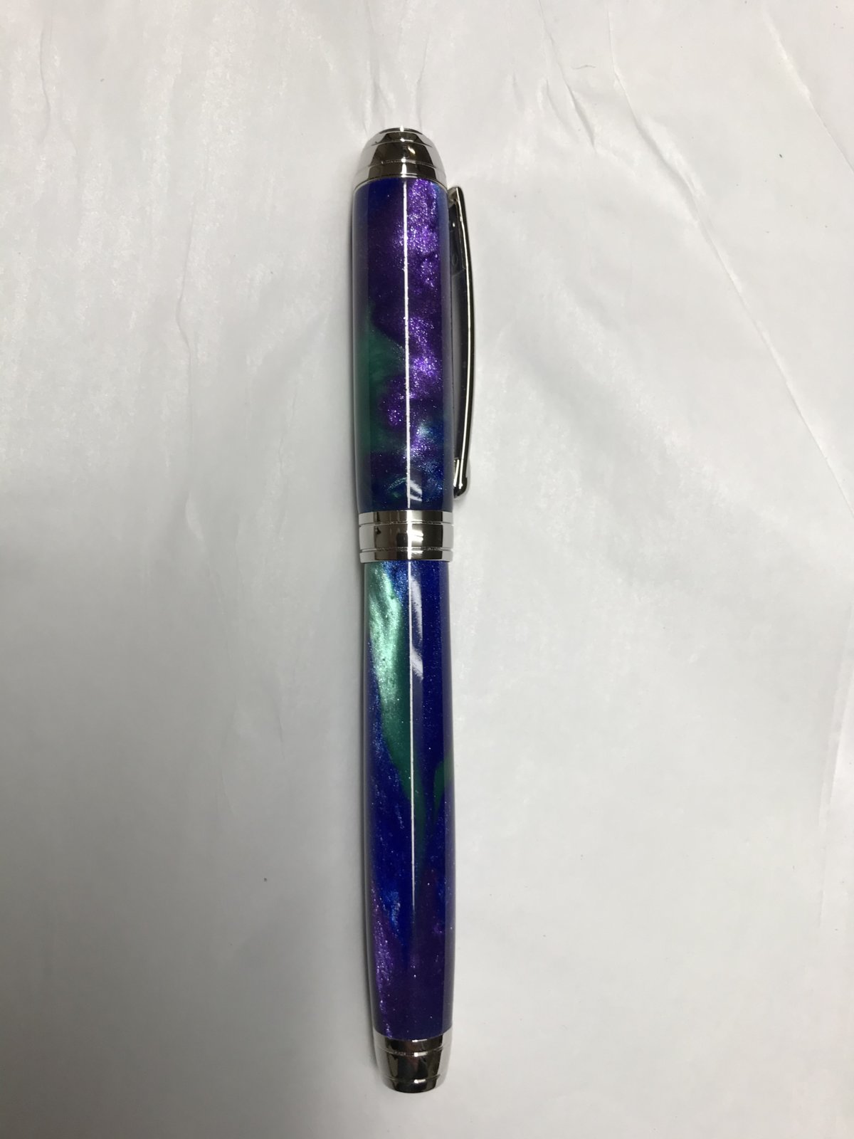 First off thanks to those that recommended this pen in a different post, it's much better for a smaller hand than the Jr sized pens. I made the blank with Silmar 41 dyed with purple, blue, and turquoise green mica which I added HoK ice pearls to. This thing sparkles beyond belief which the pics don't show. I included 2 short vids but they still don't do it justice. After making her bf a FP for the last 3 years she decided she wanted one and I was happy to oblige. My only complaint about this kit is the finial cap was a bear to press in, I was afraid I would blow the blank apart. Otherwise it's a high quality kit that I definitely recommend, I already purchased a second kit for myself.
