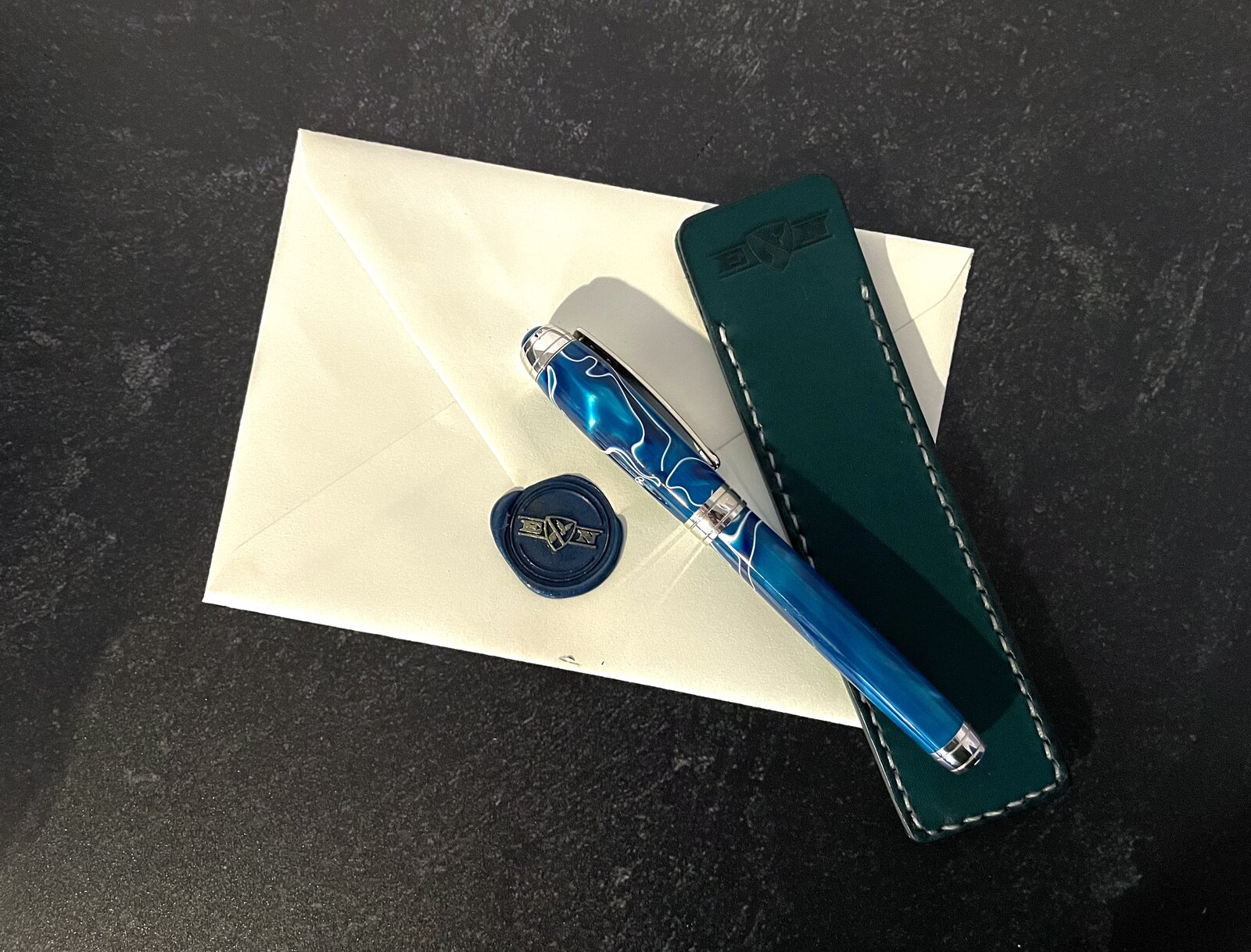 The blank on the pen is an Omas Aqua di Bologna—great stuff. Kit is a Mistral FP. The leather was the Minerva from Badalassi Carlo tannery in Ortensia (turquoise). A very Italian themed combo!