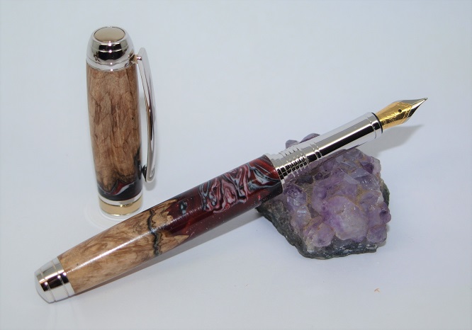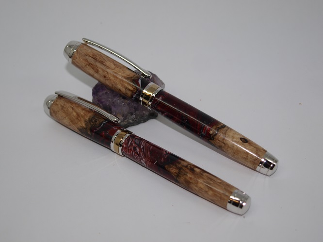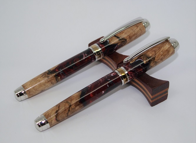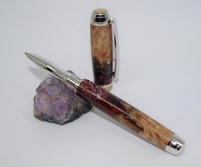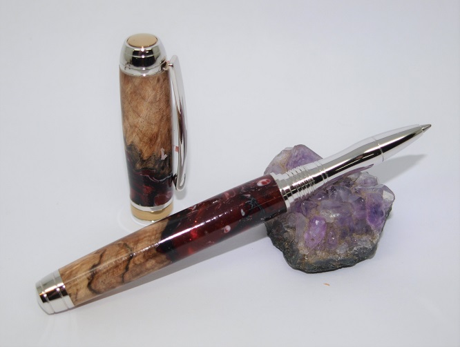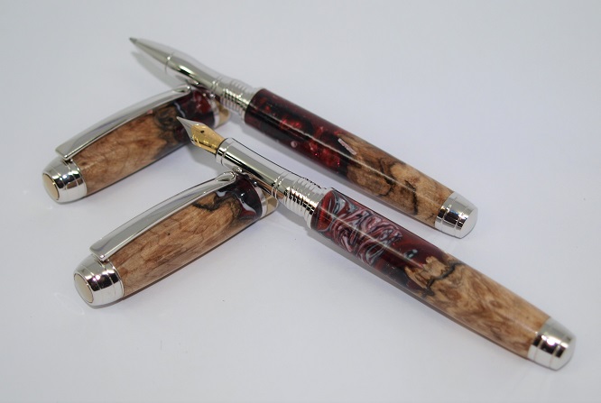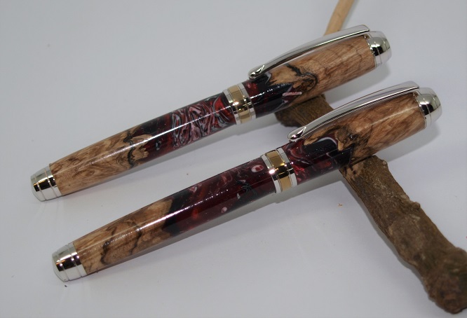 A Mistral RB & Fountain Pen set . Titanium and Gold accent plating. Made using a pair of Burl and Alumilite Hybrid blanks. Melamine Lacquer finish.