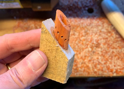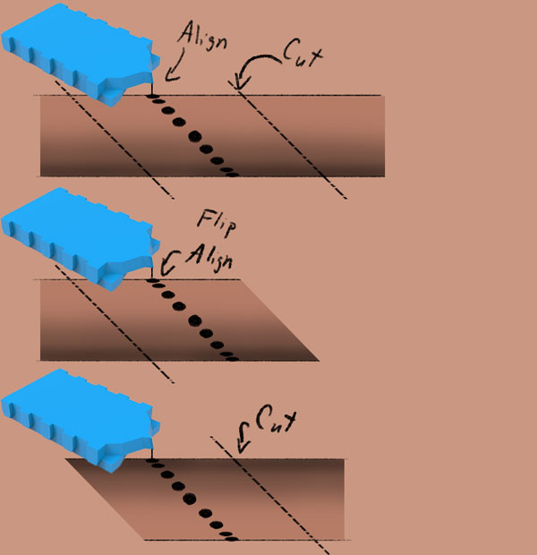 To hold the piece steady I built chips with teeth along the sides to slide down the miter box walls. The chips also have a pointy end so they can align with the holes I drilled. This all makes it easy to make repeatable cuts.