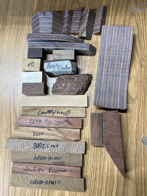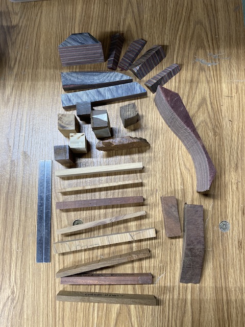 Mixed smalls, thin cuts: Greenheart, Bog Cedar, Diamondwood, Brazil Nut