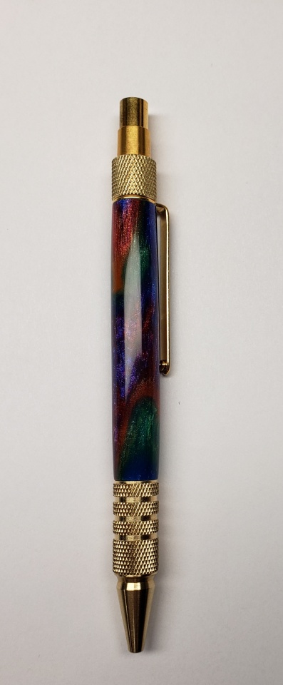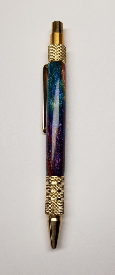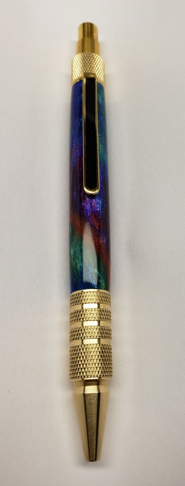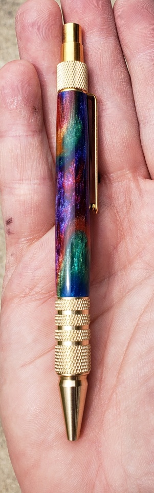 The blank is called "oil slick" by Tim McKenzie. Simply beautiful. I can't take good pics so I included one in my hand which shows the colors better!