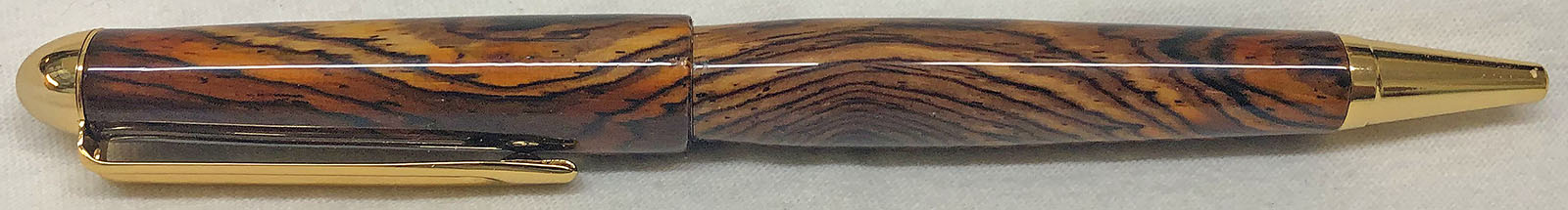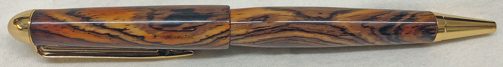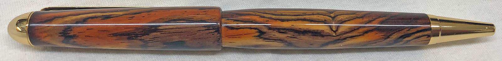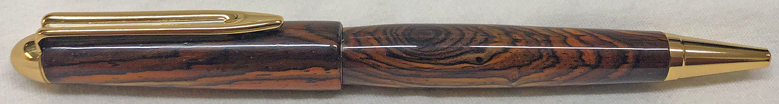 I just finished up a PSI Premium Designer NT modified to eliminate the stock center band. The blank is a piece of Cocobolo that was imported from Costa Rica. It has Gold plating and I finished it with my standard CA regimen. Although it only comes in Gold, I prefer the Premium Designer kit over the standard kits because it has 8mm tubes and uses Parker style refills.