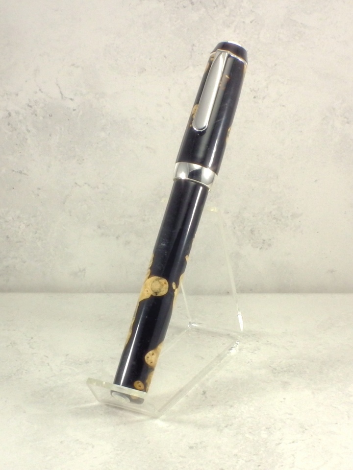 I used an El Toro for the base, as I picked some up on sale a while back. I like the silver hardware, but not the small length. He likes larger pens. I did a closed end barrel, but ran into problems with the length. Because of the nature of the blank, I needed to use the brass tube to be able to insert the section. I thought, No problem. I'll just drill it out full length for the converter with a 9mm bit, and then drill out a shallow hole for the tube. Worked all the way up to the final finishing cuts. Kabooom. The blank is not strong enough without some kind of support. Normally on my custom pens, I sleeve it with ebonite or alumilite. Since I was working with a kit pen, no problem with these blanks, I never considered that half of the barrel was unsupported.
