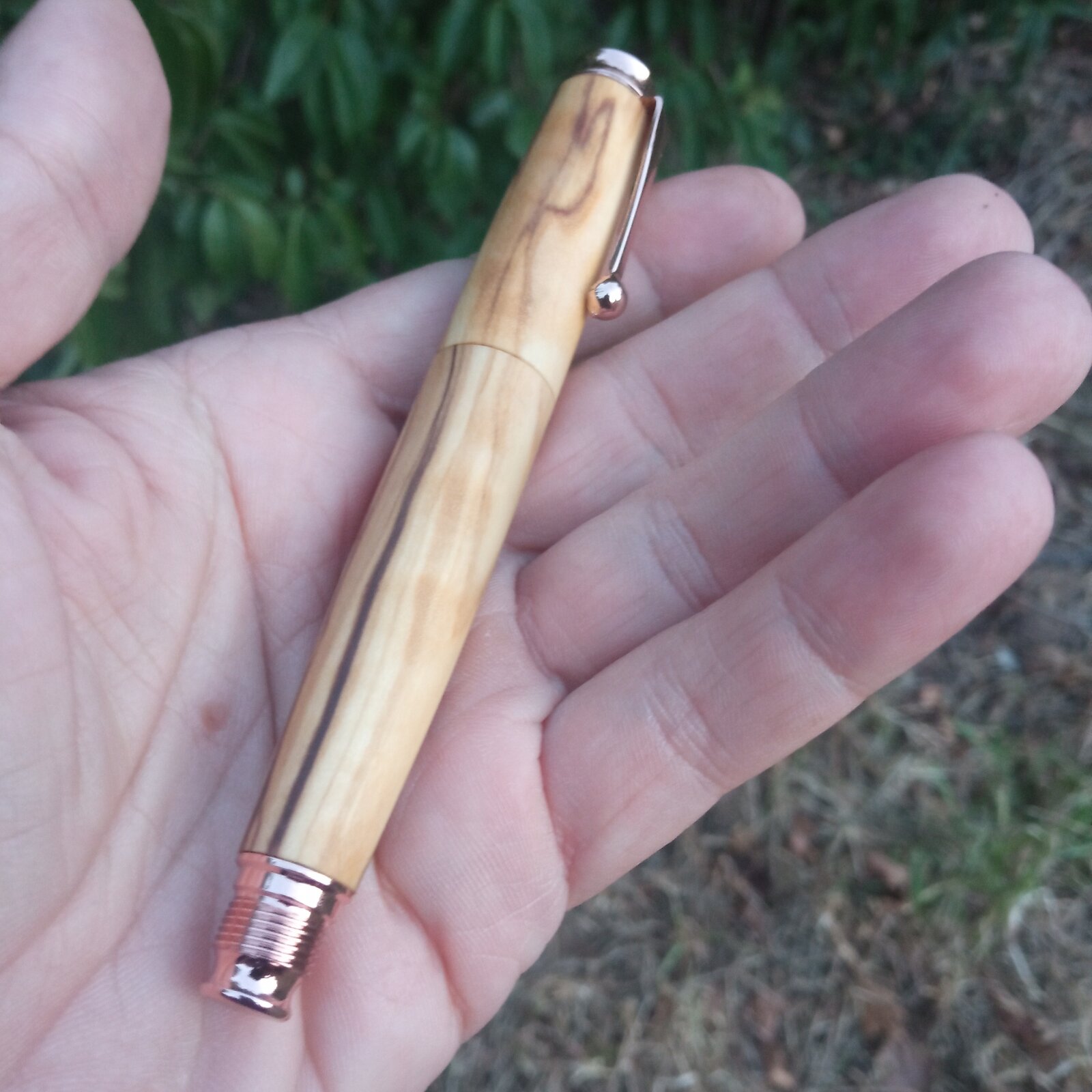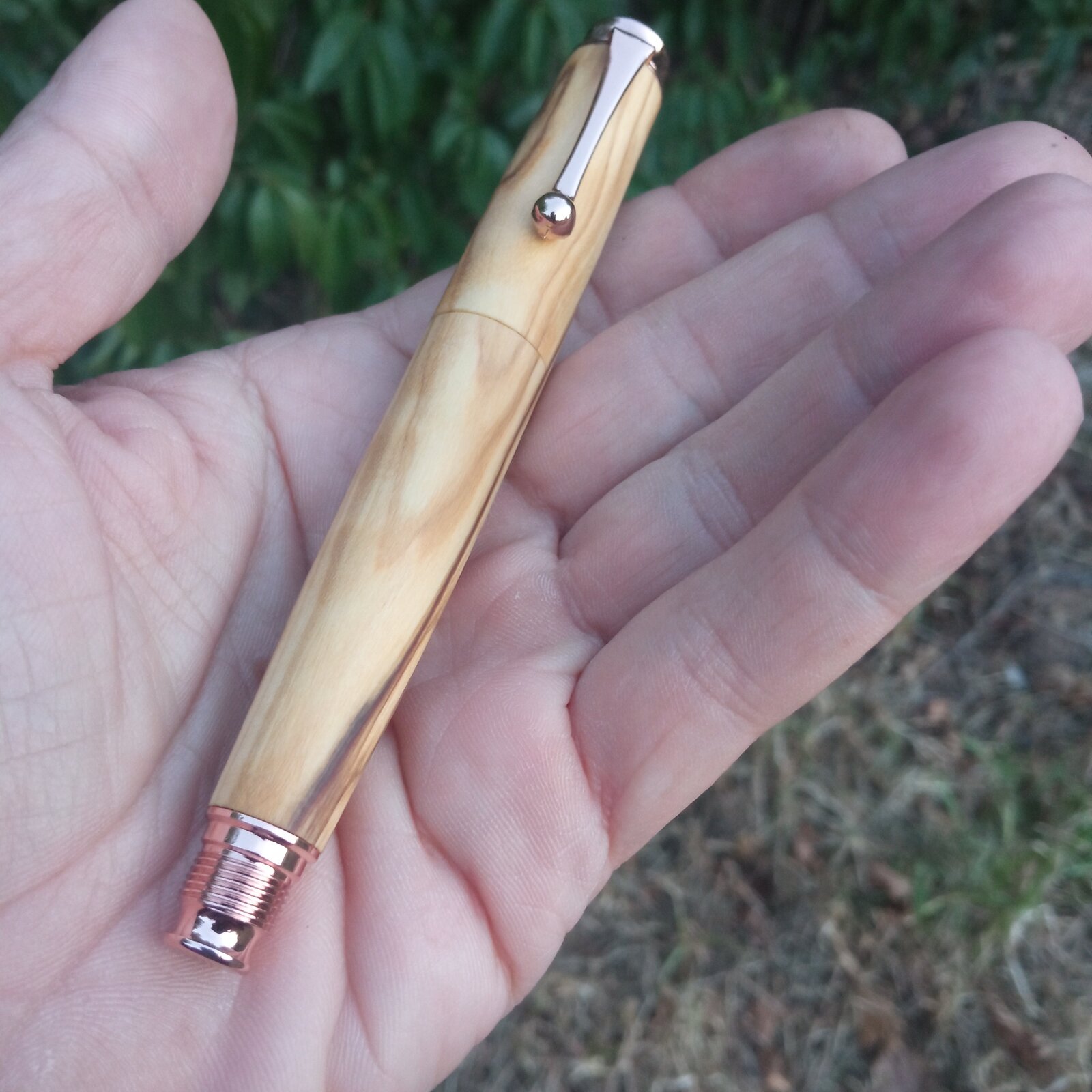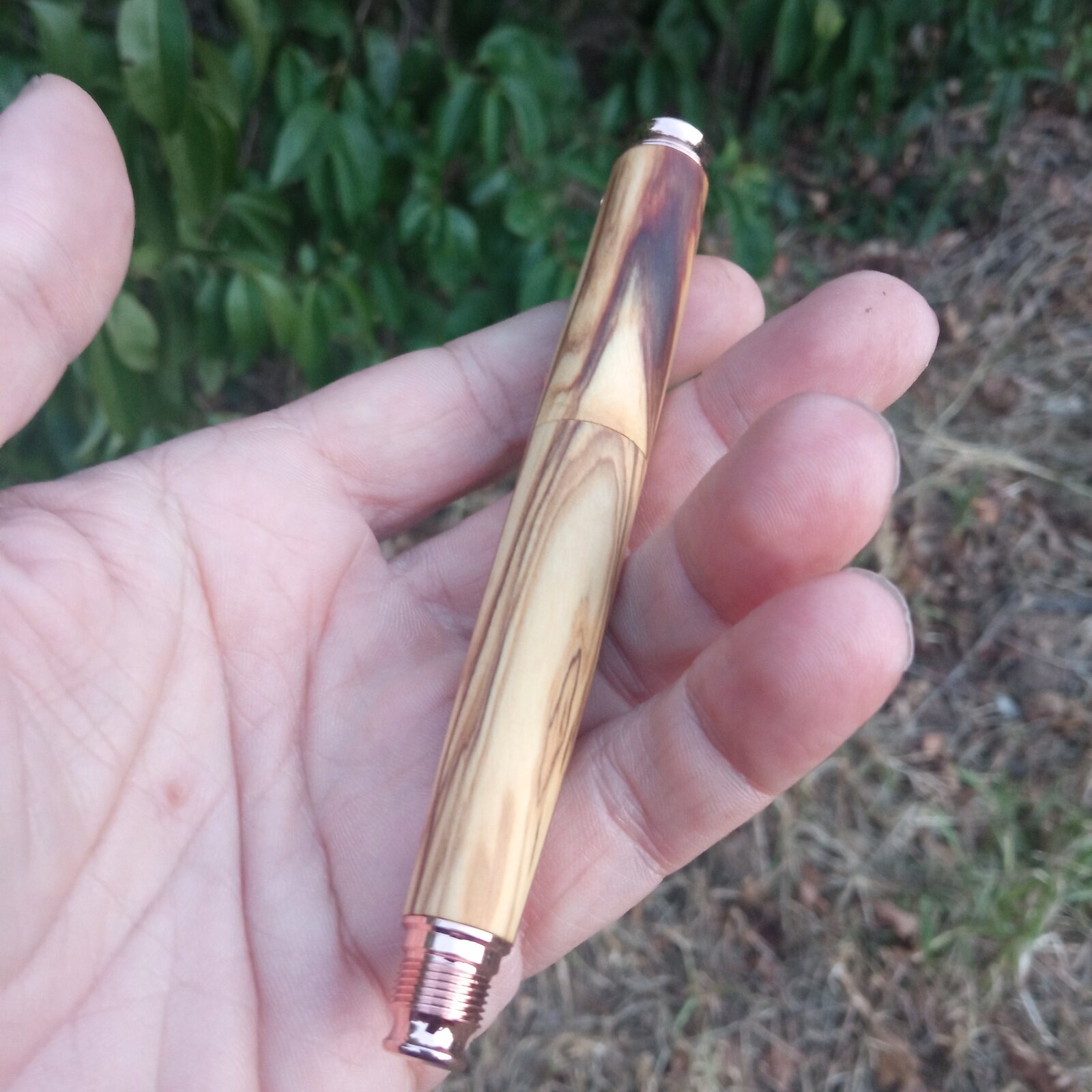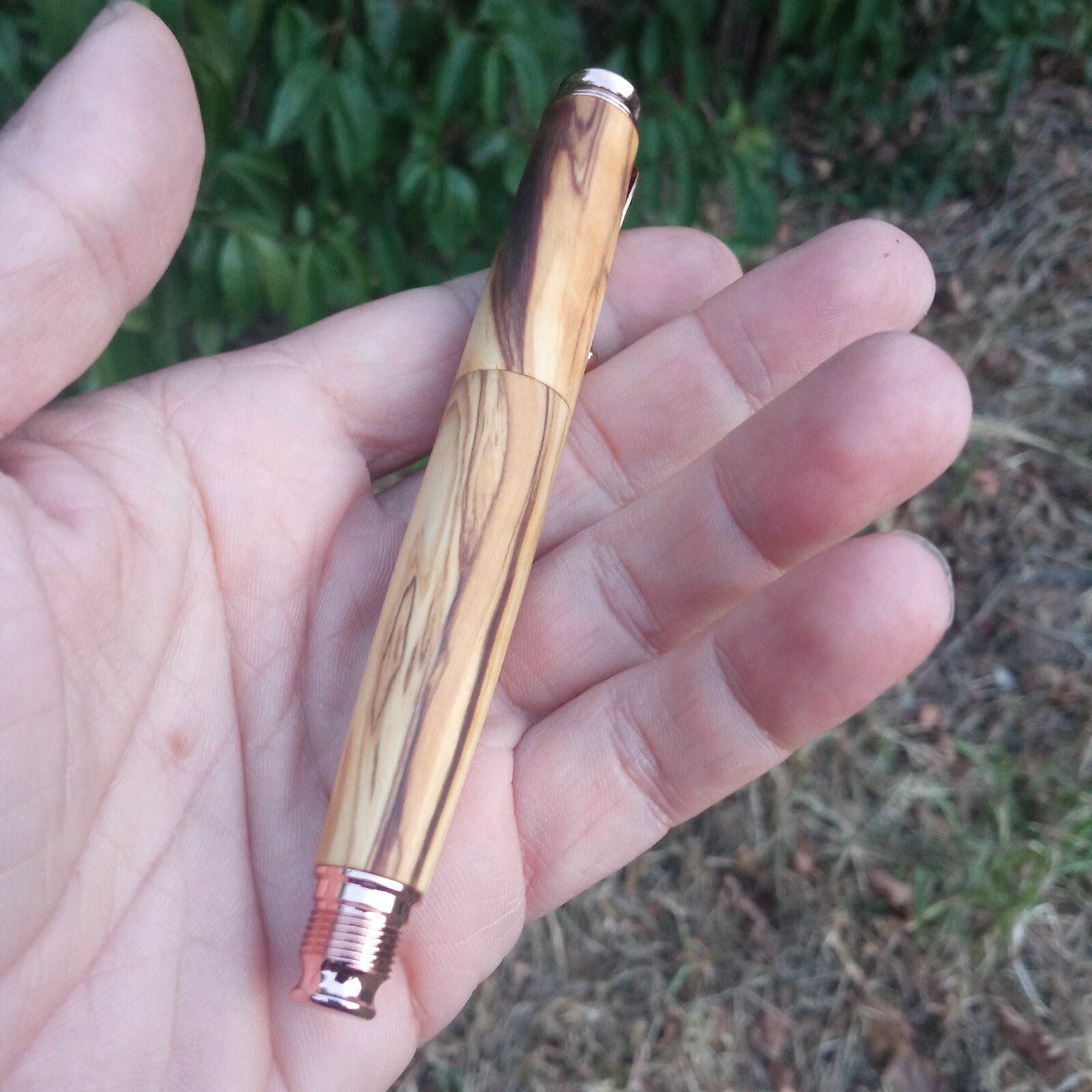 I just finished this rollerball made from a nice piece of highly figured olive wood. I used an omega pen kit from taylors mirfield which i modified to make a chubby looking, one piece pen. I didn't manage to achieve grain continuation all over the pen and this was most likely due to misaligned drilling of the blanks. I use a bench drill that is not that consistent as drilling on the lathe; the same axis of drilling is difficult to be achieved. I filed down the metal center ring of the kit and tried to achieve a seamless look. I finished the pen with oil which i used to wet sand the pen to 1000 grit.