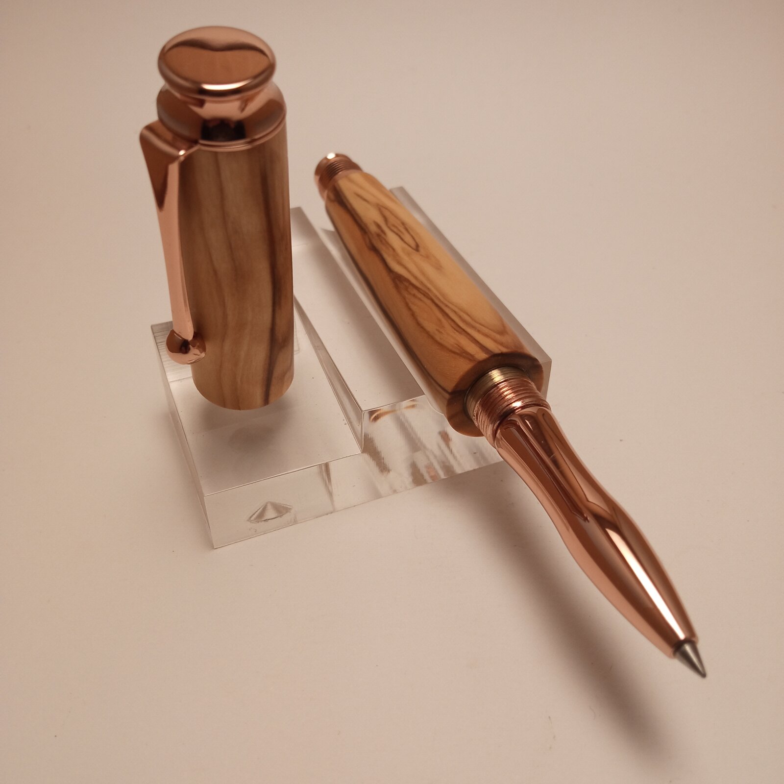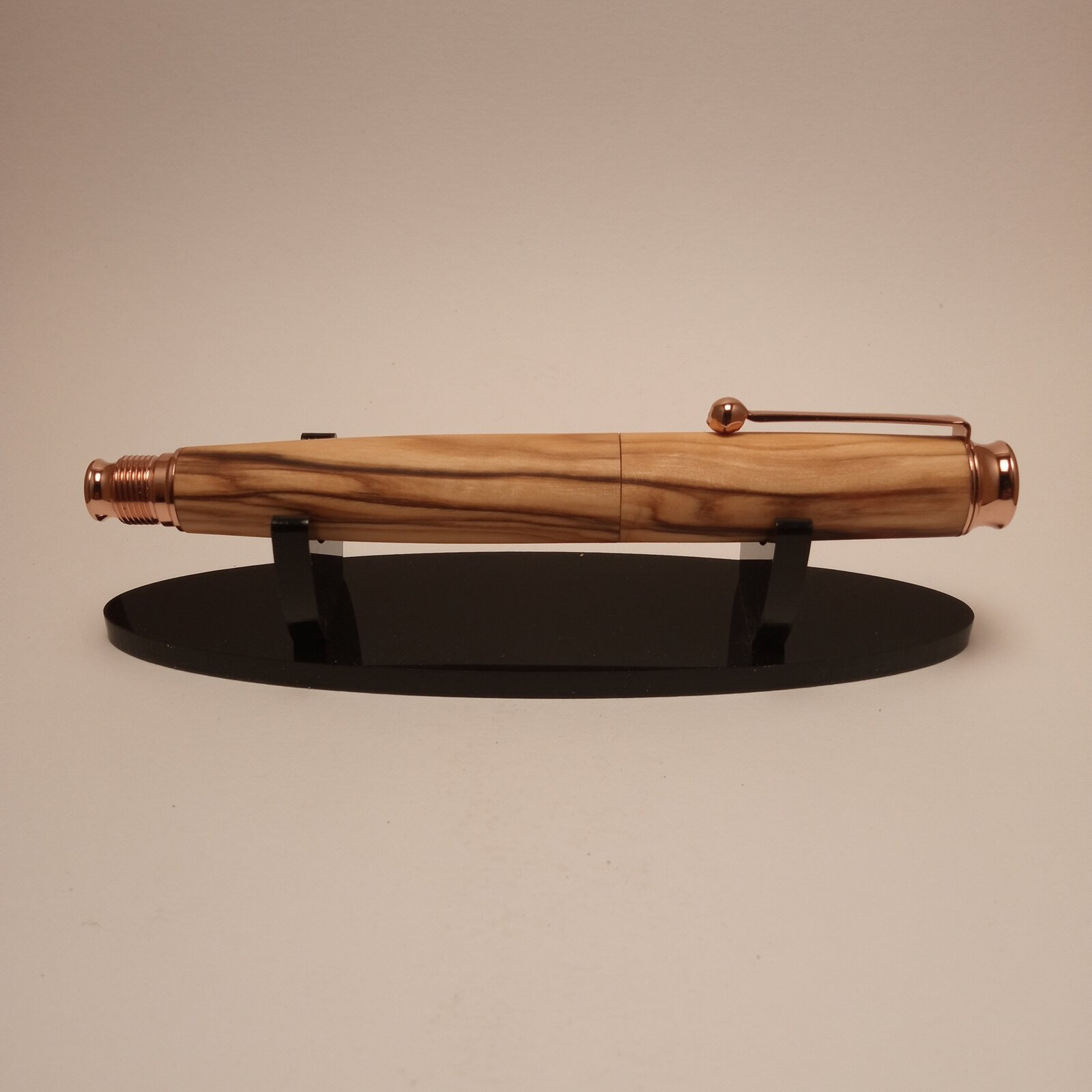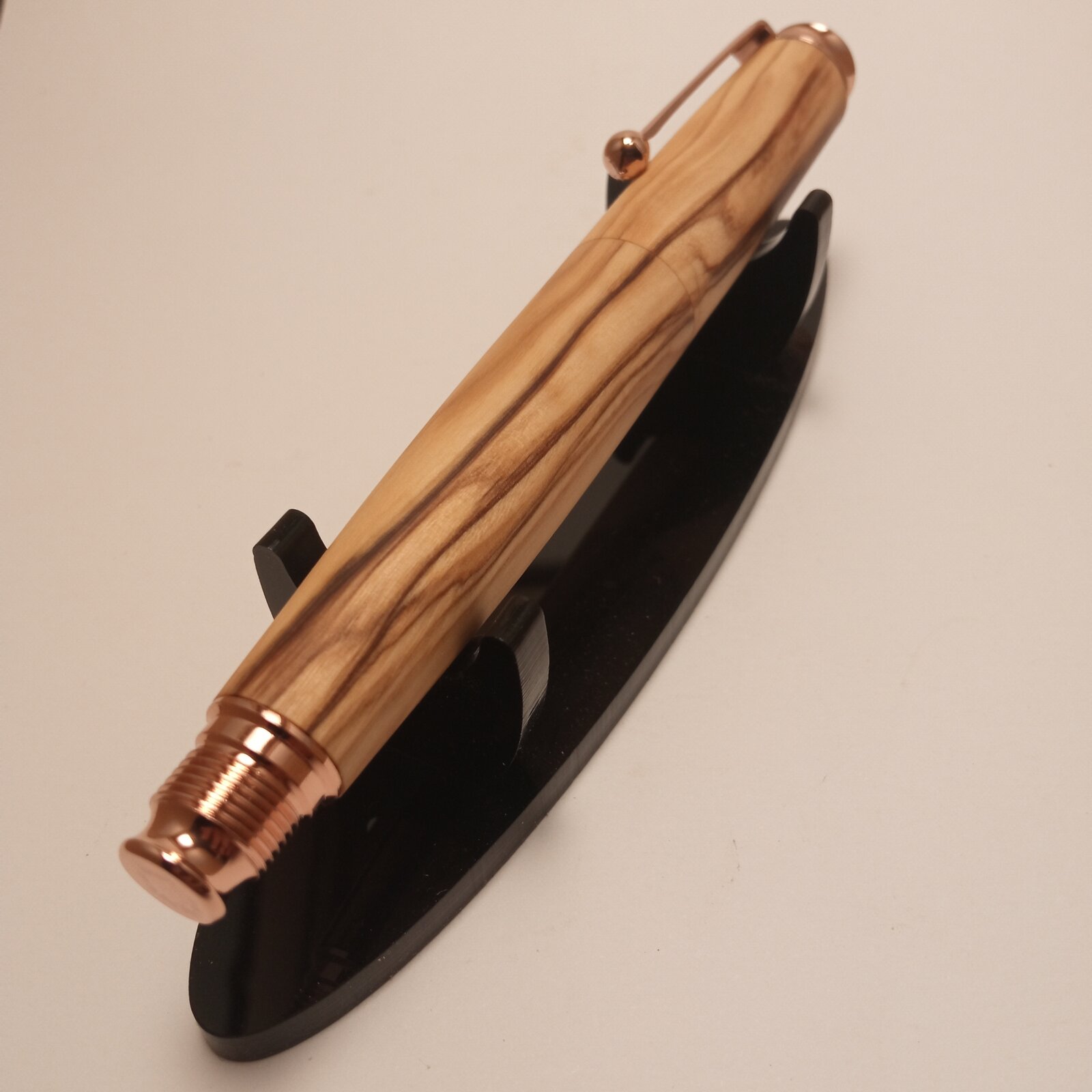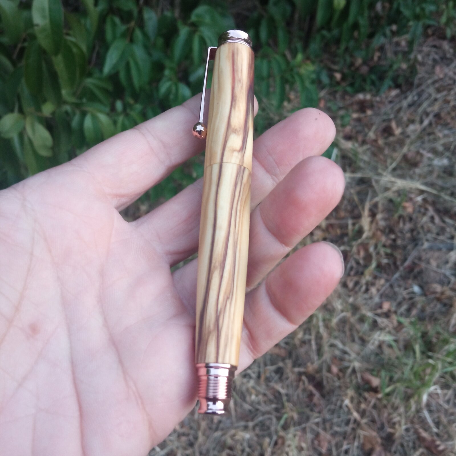 I just finished this rollerball made from a nice piece of highly figured olive wood. I used an omega pen kit from taylors mirfield which i modified to make a chubby looking, one piece pen. I didn't manage to achieve grain continuation all over the pen and this was most likely due to misaligned drilling of the blanks. I use a bench drill that is not that consistent as drilling on the lathe; the same axis of drilling is difficult to be achieved. I filed down the metal center ring of the kit and tried to achieve a seamless look. I finished the pen with oil which i used to wet sand the pen to 1000 grit.