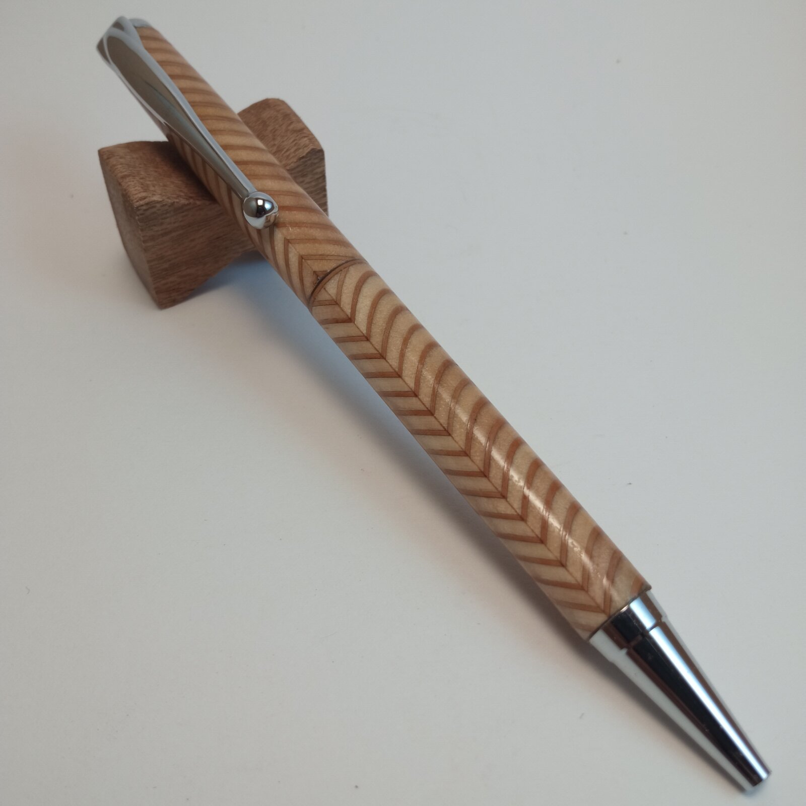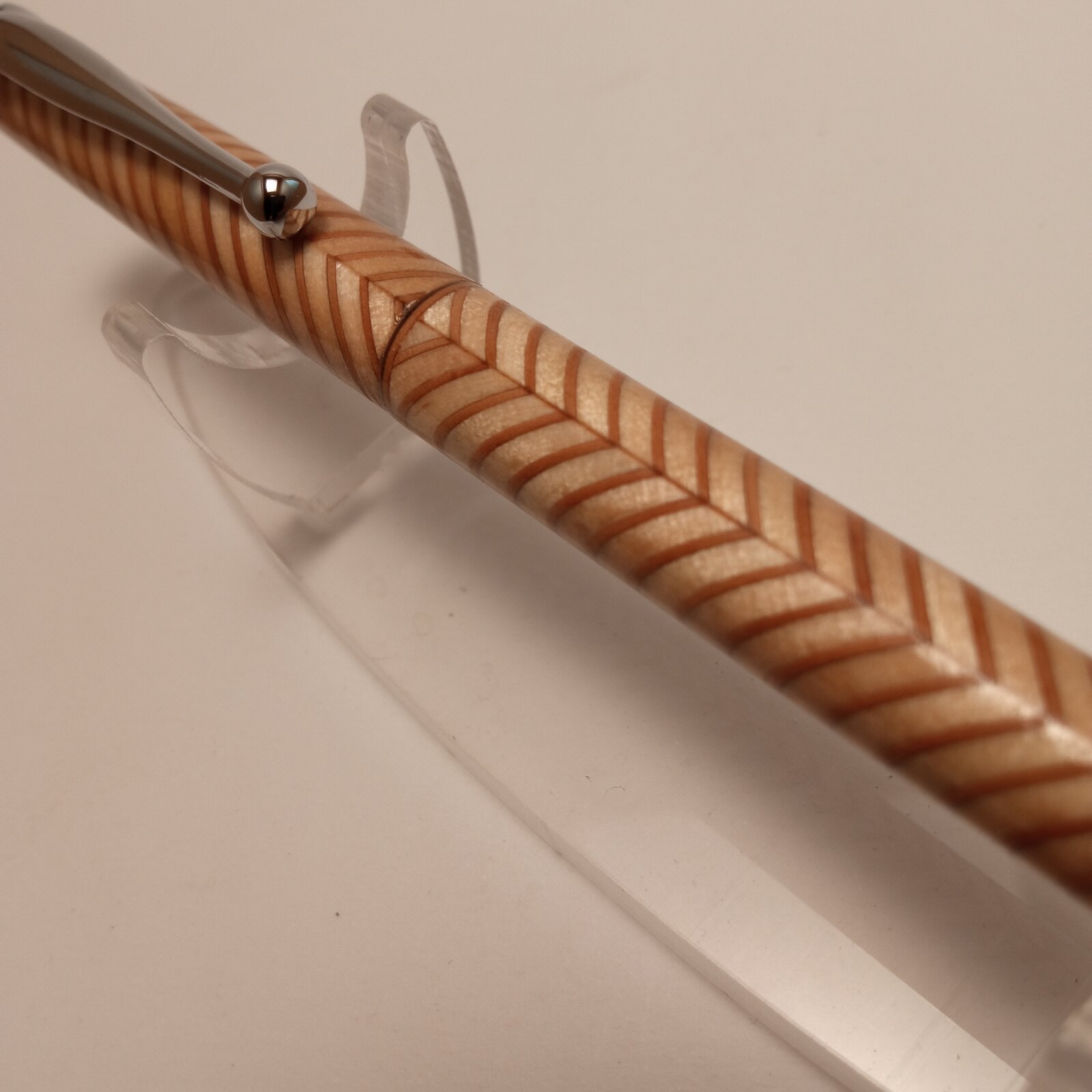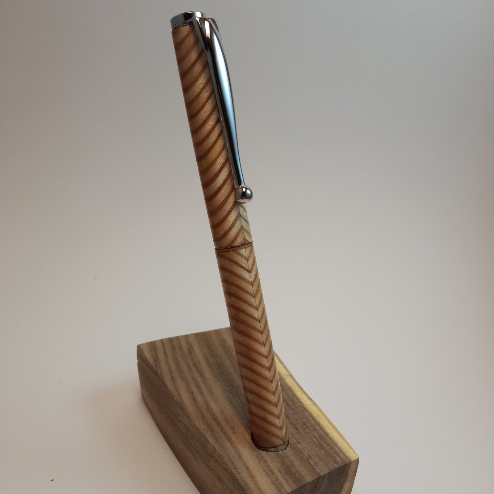 I finished this herringbone- like pen made from walnut veneer and tongue depressors ( i think birch). Didn't come out great but not bad either. I think that tongue depressors are not stable enough for such patterns,maybe table saw strips would be better. Also keeping the pen's twist action was a mistake; next time i ll keep the blank a single piece. Cheers