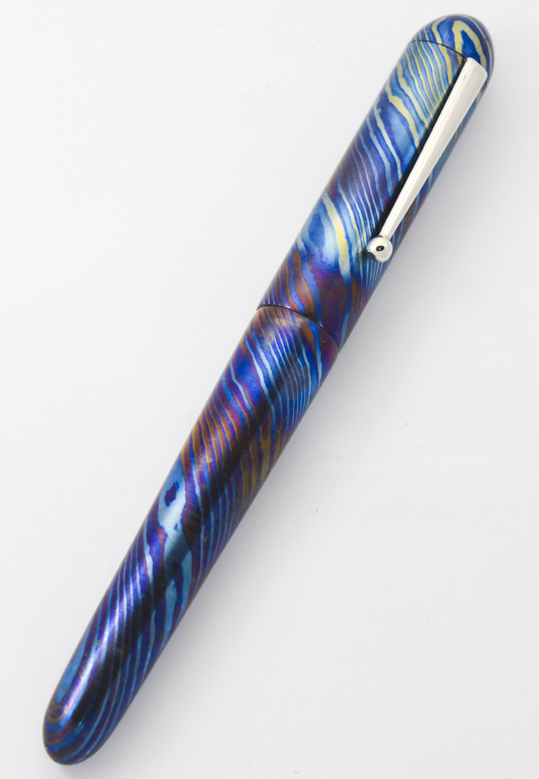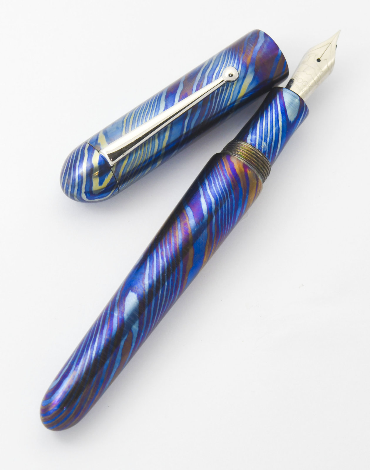 Made from a 18 mm round bar of 4 alloy MokuTiZr or (Mokume Titanium Laminate Zirconium Damascus ). This was my second go at this material. This material has a life of it's own. Put in in cool water and it lightens the color of the alloy and sharpens the interface between metals..... hold it in your hand and the darker blues come out. Played with torch time on the cap, section and lower portion of the barrel to get a look that seemed nice. At 1 AM and tired....anything looks nice. Front section with Bock #6 nib and feed. Don't plan on making any more for a while. It is outrageously expensive material and hard on tools. Donating this one to a Gala Auction for a Children's Benefit later this year. Hope you like it. Doc