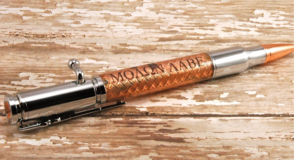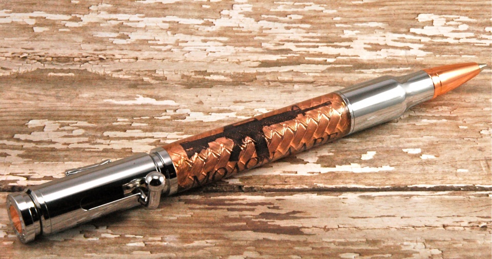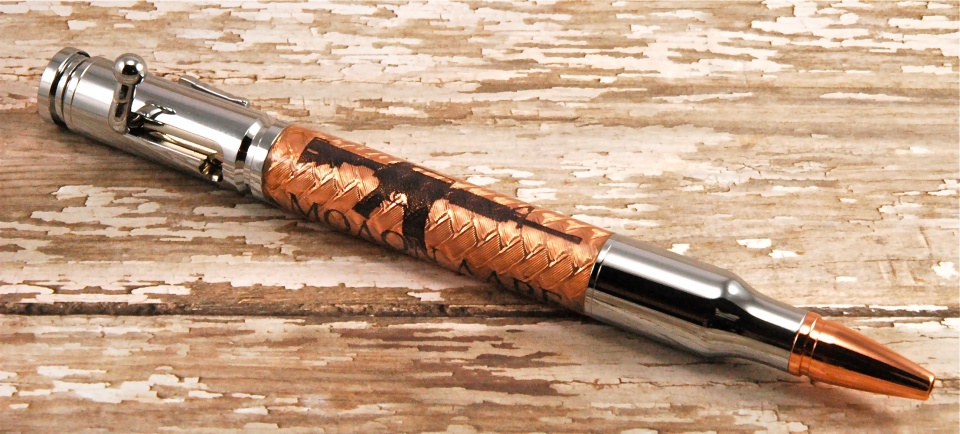 A bolt action pen with an automatic rifle sillouette?Great work on the copper tape,Looks just like copper wire weave.