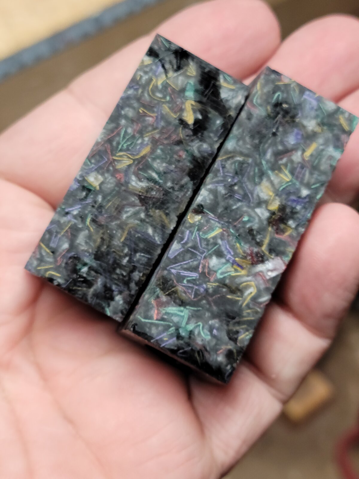 This is a simple chrome Diamond Knurl rollerball. I may still add a matching finial, but I'm feeling lazy and have a lot more ready to mount and turn. Hmm, we'll see. Anyway, I really like this blank, Molten in Silver from EB. It looks like confetti set in a chatoyant silver resin. The pictures don't really do it justice. The inside of the blank is painted in black enamel. I finished it with 2 coats of GluBoost med and 2 coats of thin, then wet sanded through the Zona paper grits