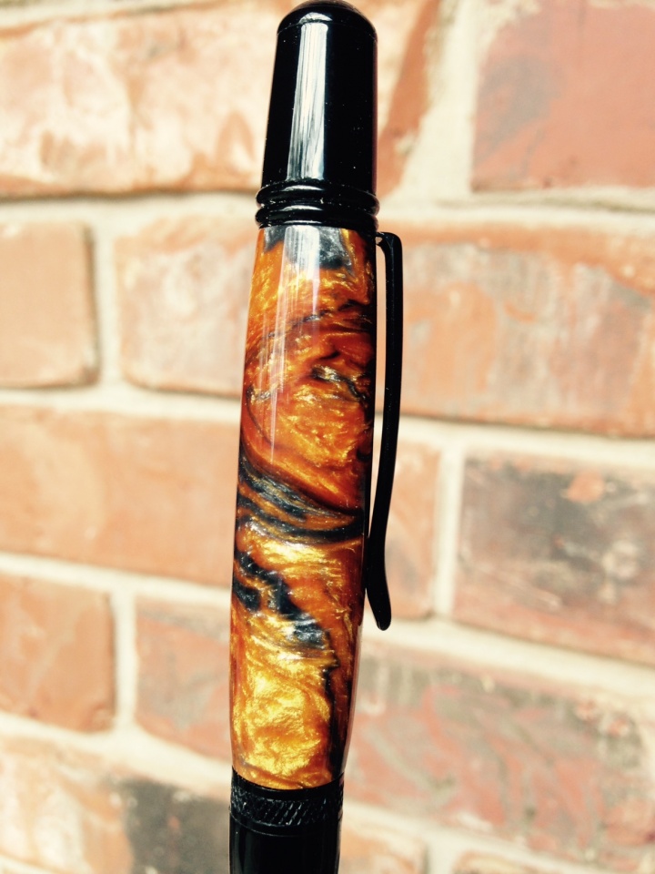 Here is a very colorful acrylic blank called "Molten Metal" from WC. Quite a bit of depth to it as well. Turned very smooth with continuous ribbons - no chips. Think I'll try another one. C & C always welcome.
